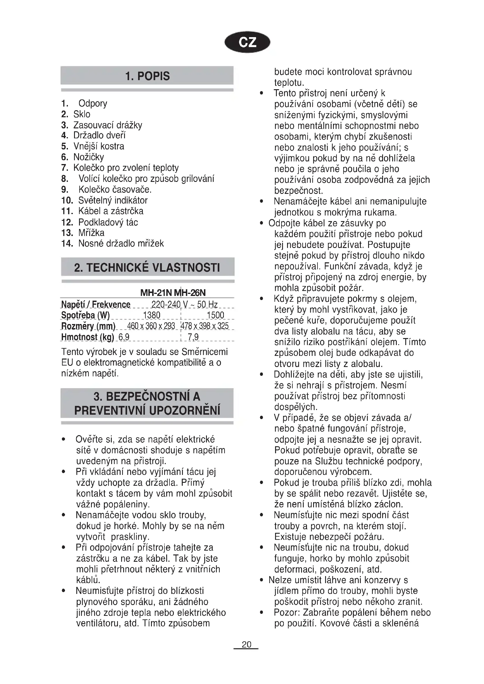 - Pozor: Zabraňte popálení během nebo po použití. Kovové části a skleněná Napětí / Frekvence 220-240 V ~ 50 Hz Spotřeba (W) 1380 1500 Rozměry (mm) 460 x 360 x 293 478 x 398 x 325 Hmotnost (kg) 6,9 7,9 MH-21N MH-26N21 okénka se mohou ohřát na velmi vysokou teplotu. Nedotýkejte se těchto částí při otvírání a zavírání dveří.