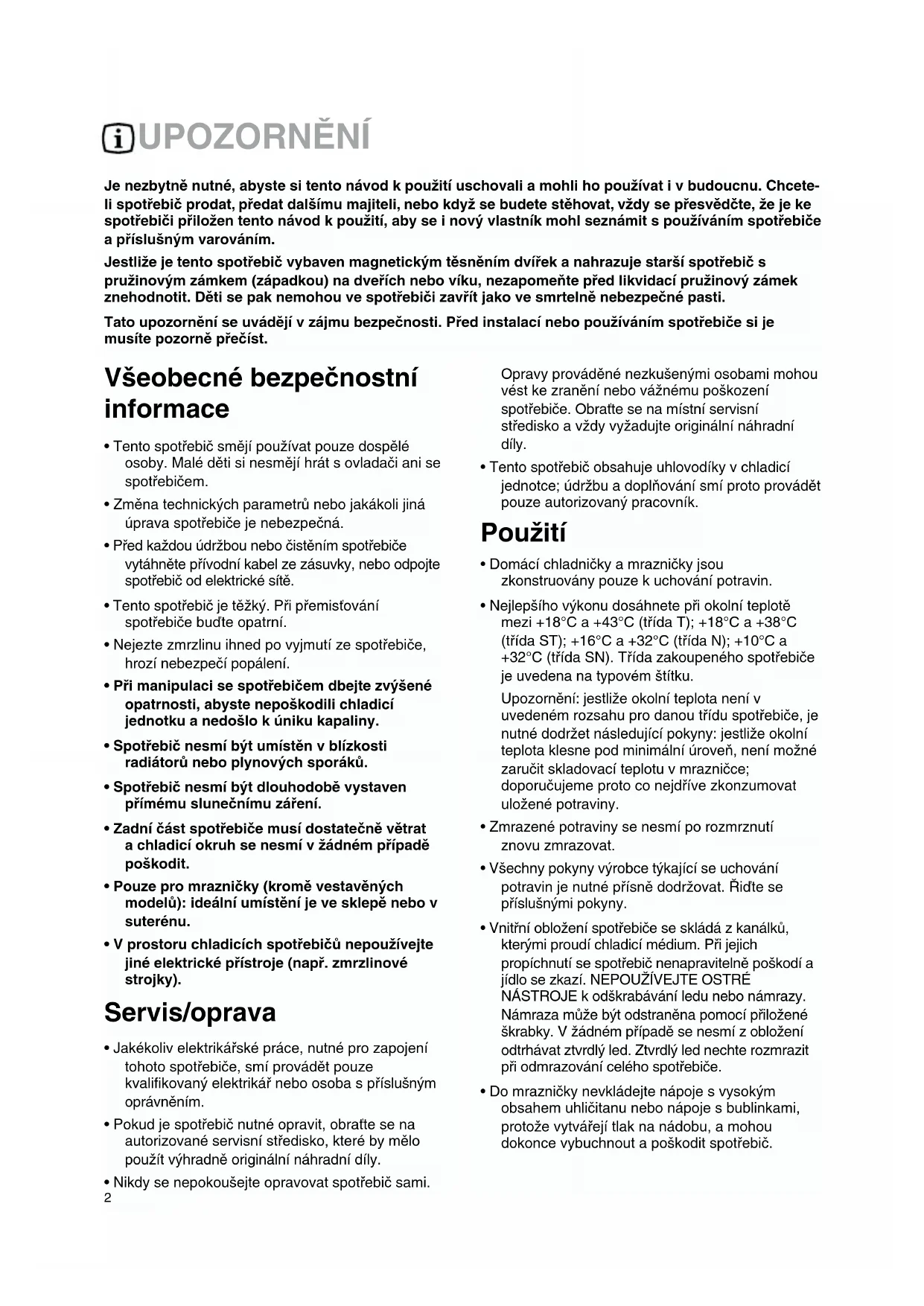 пользователя Морозильная камера NNoottiiccee dd’’uuttiilliissaattiioonn Chladnička Réfrigérateur Koelautomaat GGeebbrruuiikkssaaaannwwiijjzziinngg2 UPOZORNĚNÍ Je nezbytně nutné, abyste si tento návod k použití uschovali a mohli ho používat i v budoucnu. Chcete- li spotřebič prodat, předat dalšímu majiteli, nebo když se budete stěhovat, vždy se přesvědčte, že je ke spotřebiči přiložen tento návod k použití, aby se i nový vlastník mohl seznámit s používáním spotřebiče a příslušným varováním. Jestliže je tento spotřebič vybaven magnetickým těsněním dvířek a nahrazuje starší spotřebič s pružinovým zámkem (západkou) na dveřích nebo víku, nezapomeňte před likvidací pružinový zámek znehodnotit. Děti se pak nemohou ve spotřebiči zavřít jako ve smrtelně nebezpečné pasti. Tato upozornění se uvádějí v zájmu bezpečnosti. Před instalací nebo používáním spotřebiče si je musíte pozorně přečíst. Všeobecné bezpečnostní informace