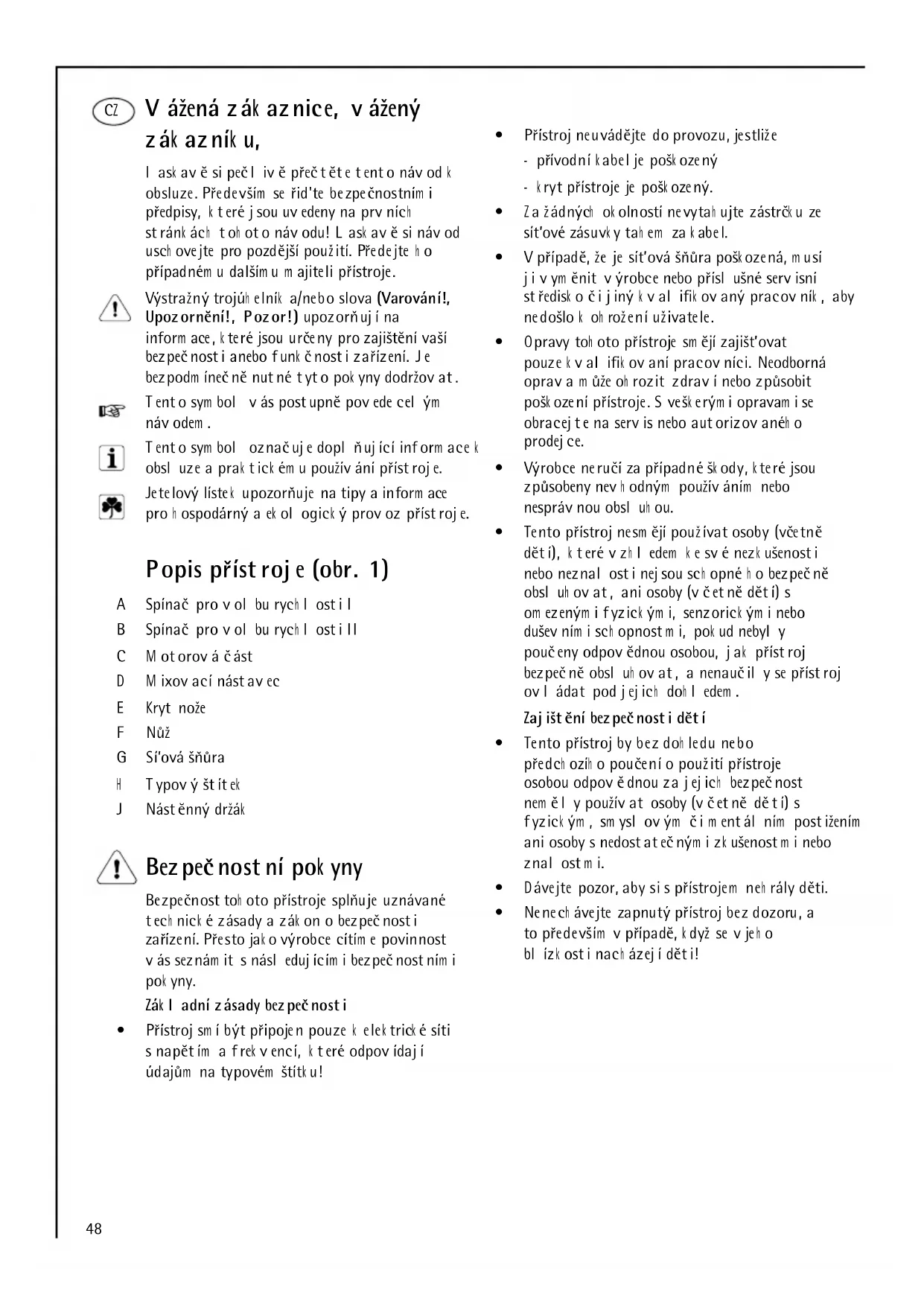 - EM C direk tiv 89 /336/EEC m ed tilføyelser 9 3/31/EEC og 9 3/68/EEC48 Vážená zák aznice, vážený zák azník u, lask avĕ si pečlivĕ přečtĕte tento návod k obsluze. Především se řid'te bezpečnostním i předpisy, k teré jsou uvedeny na prvních stránk ách toh oto návodu! Lask avĕ si návod usch ovejte pro pozdĕjší použití. Předejte h o případném u dalším u m ajiteli přístroje. Výstražný trojúh elník a/nebo slova (Varování!, Upozornĕní!, Pozor!) upozorňují na inform ace, k teré jsou určeny pro zajištĕní vaší bezpečnosti anebo funk čnosti zařízení. Je bezpodm ínečnĕ nutné tyto pok yny dodržovat. Tento sym bol vás postupnĕ povede celým návodem . Tento sym bol označuje doplňující inform ace k obsluze a prak tick ém u používání přístroje. Jetelový lístek upozorňuje na tipy a inform ace pro h ospodárný a ek ologick ý provoz přístroje. Popis přístroje (obr. 1) A Spínač pro volbu rych losti I B Spínač pro volbu rych losti II C M otorová část D M ixovací nástavec E Kryt nože F Nůž G Sí’ová šňůra H Typový štítek J Nástĕnný držák Bezpečnostní pok yny Bezpečnost toh oto přístroje splňuje uznávané tech nick é zásady a zák on o bezpečnosti zařízení. Přesto jak o výrobce cítím e povinnost vás seznám it s následujícím i bezpečnostním i pok yny. Zák ladní zásady bezpečnosti