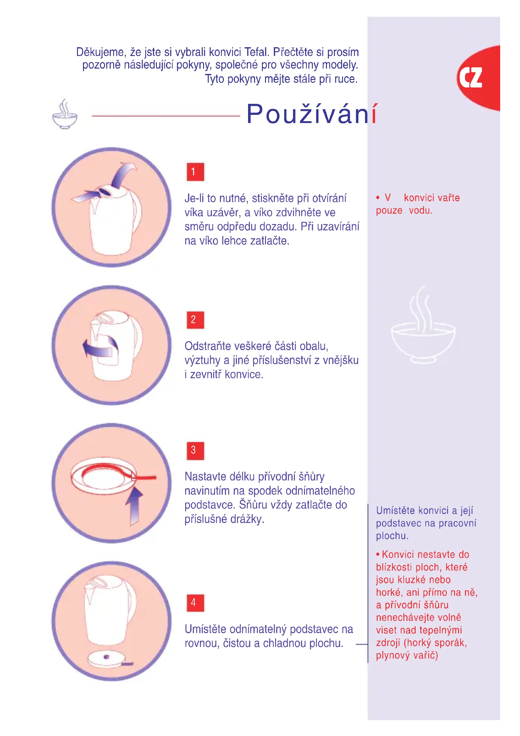 PouÏívání Dûkujeme, Ïe jste si vybrali konvici Tefal. Pfieãtûte si prosím pozornû následující pokyny, spoleãné pro v‰echny modely. Tyto pokyny mûjte stále pfii ruce.Pfied prvním pouÏitím konvici dvakrát aÏ tfiikrát propláchnûte vodou, neboÈ mÛÏe obsahovat prach. Vyplachujte zvlá‰È konvici a filtr. Pfied prvním pouÏitím si zkontrolujte, zda napûtí uvedené na typovém ‰títku naspodu pfiístroje souhlasí s napûtím, na které bude rychlovarná konvice pfiipojena.