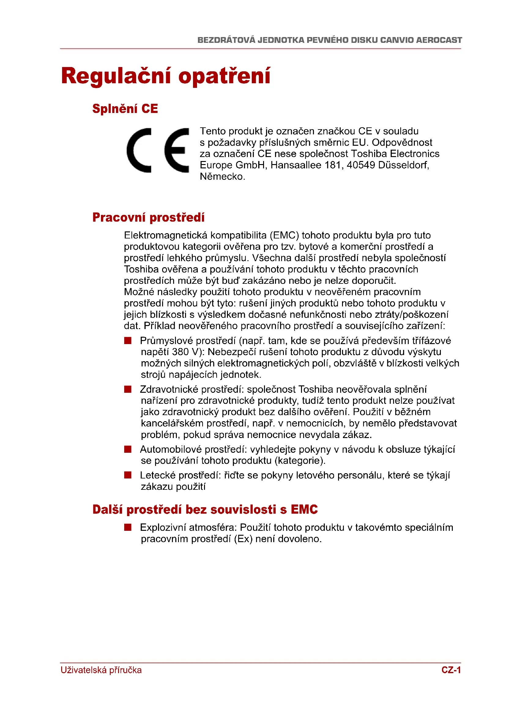 Wireless connection PC/Mac . . . . . . . . . . . . . . . 20Uživatelská příručka CZ-1 BEZDRÁTOVÁ JEDNOTKA PEVNÉHO DISKU CANVIO AEROCAST Uživatelsk á příručka Regulační opatření Splnění CE Pracovní prostředí Elektromagnetická kompatibilita (EMC) tohoto produktu byla pro tuto produktovou kategorii ověřena pro tzv. bytové a komerční prostředí a prostředí lehkého průmyslu. Všechna další prostředí nebyla společností Toshiba ověřena a používání tohoto produktu v těchto pracovních prostředích může být buď zakázáno nebo je nelze doporučit. Možné následky použití tohoto produktu v neověřeném pracovním prostředí mohou být tyto: rušení jiných produktů nebo tohoto produktu v jejich blízkosti s výsledkem dočasné nefunkčnosti nebo ztráty/poškození dat. Příklad neověřeného pracovního prostředí a souvisejícího zařízení: ■ Průmyslové prostředí (např. tam, kde se používá především třífázové napětí 380 V): Nebezpečí rušení tohoto produktu z důvodu výskytu možných silných elektromagnetických polí, obzvláště v blízkosti velkých strojů napájecích jednotek. ■ Zdravotnické prostředí: společnost Toshiba neověřovala splnění nařízení pro zdravotnické produkty, tudíž tento produkt nelze používat jako zdravotnický produkt bez dalšího ověření. Použití v běžném kancelářském prostředí, např. v nemocnicích, by nemělo představovat problém, pokud správa nemocnice nevydala zákaz. ■ Automobilové prostředí: vyhledejte pokyny v návodu k obsluze týkající se používání tohoto produktu (kategorie). ■ Letecké prostředí: řiďte se pokyny letového personálu, které se týkají zákazu použití Další prostředí bez souvislosti s EMC ■ Explozivní atmosféra: Použití tohoto produktu v takovémto speciálním pracovním prostředí (Ex) není dovoleno. Tento produkt je označen značkou CE v souladu s požadavky příslušných směrnic EU. Odpovědnost za označení CE nese společnost Toshiba Electronics Europe GmbH, Hansaallee 181, 40549 Düsseldorf, Německo.Uživatelská příručka CZ-2 BEZDRÁTOVÁ JEDNOTKA PEVNÉHO DISKU CANVIO AEROCAST Následující informace jsou určeny pouze pro členské státy EU: REACH - Prohlášení o shodě