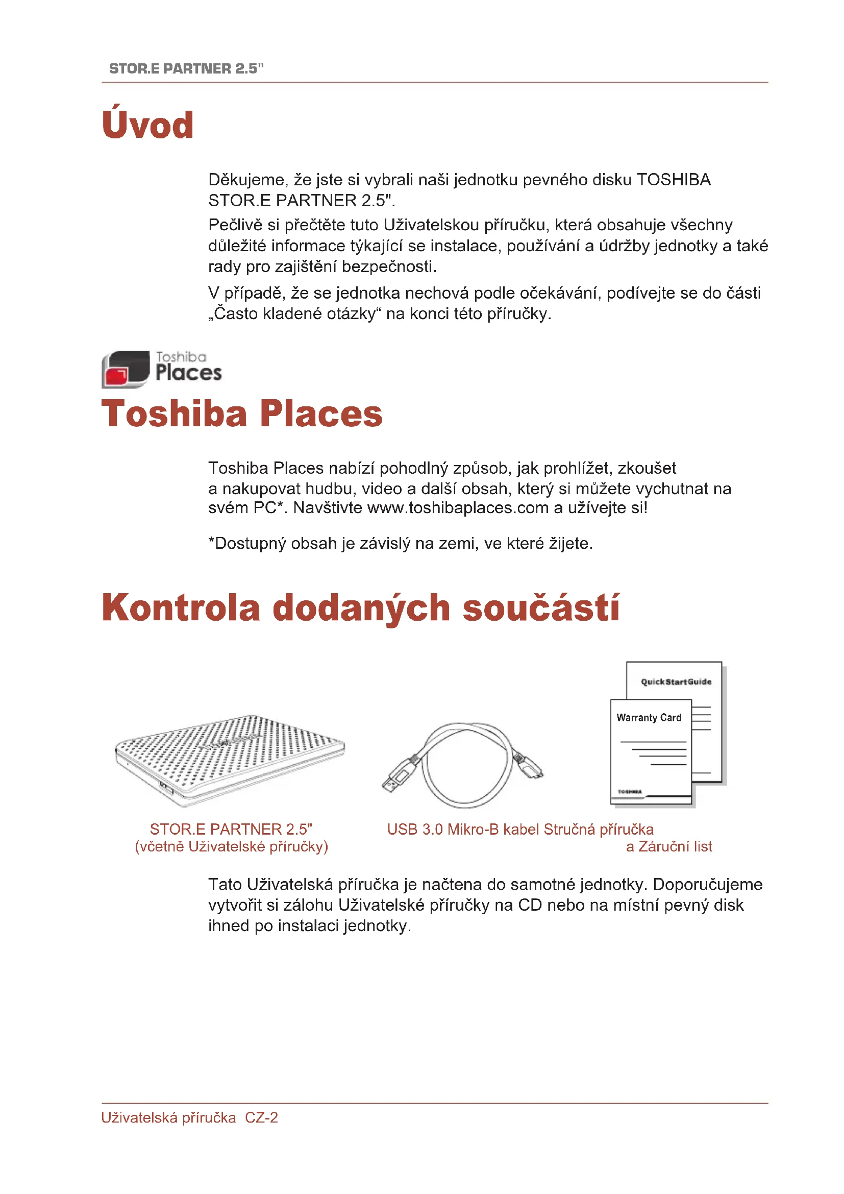 Úvod Děkujeme, že jste si vybrali naši jednotku pevného disku TOSHIBA STOR.E PARTNER 2.5". Pečlivě si přečtěte tuto Uživatelskou příručku, která obsahuje všechny důležité informace týkající se instalace, používání a údržby jednotky a také rady pro zajištění bezpečnosti. V případě, že se jednotka nechová podle očekávání, podívejte se do části „Často kladené otázky“ na konci této příručky. Toshiba Places Toshiba Places nabízí pohodlný způsob, jak prohlížet, zkoušet a nakupovat hudbu, video a další obsah, který si můžete vychutnat na svém PC*. Navštivte www.toshibaplaces.com a užívejte si! *Dostupný obsah je závislý na zemi, ve které žijete. Kontrola dodaných součástí Warranty Card