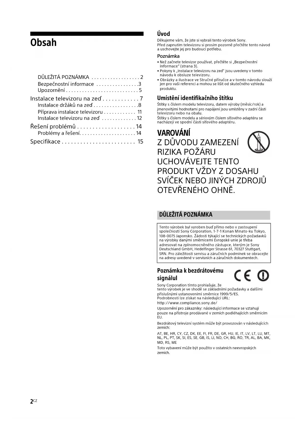 - Specifikace Úvod Děkujeme vám, že jste si vybrali tento výrobek Sony. Před zapnutím televizoru si prosím pozorně přečtěte tento návod a uschovejte jej pro budoucí potřebu.Poznámka• Než začnete televizor používat, přečtěte si „Bezpečnostní informace“ (strana 3). • Pokyny k „Instalace televizoru na zeď“ jsou uvedeny v tomto návodu k obsluze televizoru.• Obrázky a ilustrace ve Stručné příručce a v tomto návodu slouží jen pro vaši referenci a mohou se lišit od skutečného vzhledu produktu. Umístění identifikačního štítku Štítky s číslem modelu televizoru, datem výroby (měsíc/rok) a jmenovitými hodnotami pro napájení jsou umístěny v zadní části televizoru nebo na obalu. Štítky s číslem modelu a sériovým číslem síťového adaptéru se nacházejí ve spodní části síťového adaptéru. VAROVÁNÍ p. 15
