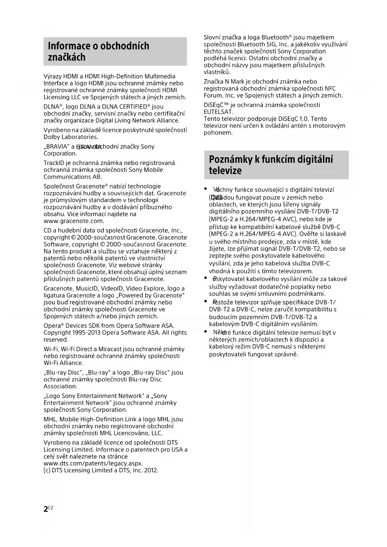 Výrazy HDMI a HDMI High-Definition Multimedia Interface a logo HDMI jsou ochranné známky nebo registrované ochranné známky společnosti HDMI Licensing LLC ve Spojených státech a jiných zemích. DLNA®, logo DLNA a DLNA CERTIFIED® jsou obchodní značky, servisní značky nebo certifikační značky organizace Digital Living Network Alliance. Vyrobeno na základě licence poskytnuté společností Dolby Laboratories. „BRAVIA“ a jsou obchodní značky Sony Corporation. TrackID je ochranná známka nebo registrovaná ochranná známka společnosti Sony Mobile Communications AB. Společnost Gracenote® nabízí technologie rozpoznávání hudby a souvisejících dat. Gracenote je průmyslovým standardem v technologii rozpoznávání hudby a v dodávání příbuzného obsahu. Více informací najdete na www.gracenote.com. CD a hudební data od společnosti Gracenote, Inc., copyright © 2000-současnost Gracenote. Gracenote Software, copyright © 2000-současnost Gracenote. Na tento produkt a službu se vztahuje některý z patentů nebo několik patentů ve vlastnictví společnosti Gracenote. Viz webové stránky společnosti Gracenote, které obsahují úplný seznam příslušných patentů společnosti Gracenote. Gracenote, MusicID, VideoID, Video Explore, logo a ligatura Gracenote a logo „Powered by Gracenote“ jsou buď registrované obchodní známky nebo obchodní známky společnosti Gracenote ve Spojených státech a/nebo jiných zemích. Opera® Devices SDK from Opera Software ASA. Copyright 1995-2013 Opera Software ASA. All rights reserved. Wi-Fi, Wi-Fi Direct a Miracast jsou ochranné známky nebo registrované ochranné známky společnosti Wi-Fi Alliance. „Blu-ray Disc“, „Blu-ray“ a logo „Blu-ray Disc“ jsou ochranné známky společnosti Blu-ray Disc Association. „Logo Sony Entertainment Network“ a „Sony Entertainment Network“ jsou ochranné známky společnosti Sony Corporation. MHL, Mobile High-Definition Link a logo MHL jsou obchodní známky nebo registrované obchodní známky společnosti MHL Licencováno, LLC. Vyrobeno na základě licence od společnosti DTS Licensing Limited. Informace o patentech pro USA a celý svět naleznete na stránce www.dts.com/patents/legacy.aspx. (c) DTS Licensing Limited a DTS, Inc. 2012. Slovní značka a loga Bluetooth® jsou majetkem společnosti Bluetooth SIG, Inc. a jakékoliv využívání těchto značek společností Sony Corporation podléhá licenci. Ostatní obchodní značky a obchodní názvy jsou majetkem příslušných vlastníků. Značka N Mark je obchodní známka nebo registrovaná obchodní známka společnosti NFC Forum, Inc. ve Spojených státech a jiných zemích. DiSEqC™ je ochranná známka společnosti EUTELSAT. Tento televizor podporuje DiSEqC 1.0. Tento televizor není určen k ovládání antén s motorovým pohonem.