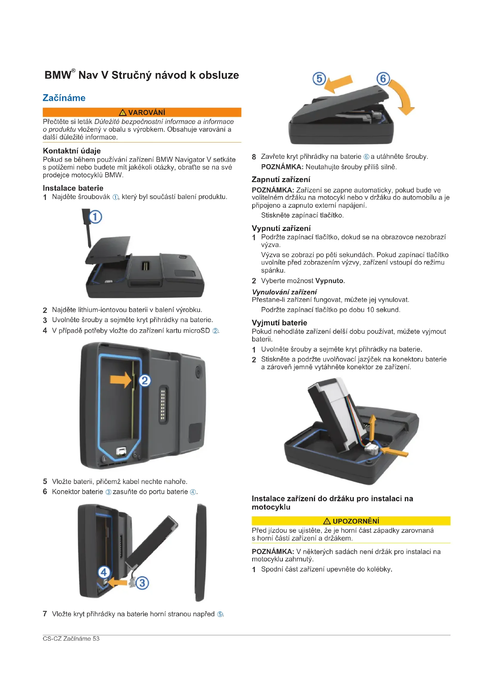 Nav V Stručný návod k obsluze Začínáme VAROVÁNÍ Přečtěte si leták Důležité bezpečnostní informace a informace o produktu vložený v obalu s výrobkem. Obsahuje varování a další důležité informace. Kontaktní údaje Pokud se během používání zařízení BMW Navigator V setkáte s potížemi nebo budete mít jakékoli otázky, obraťte se na své prodejce motocyklů BMW. Instalace baterie