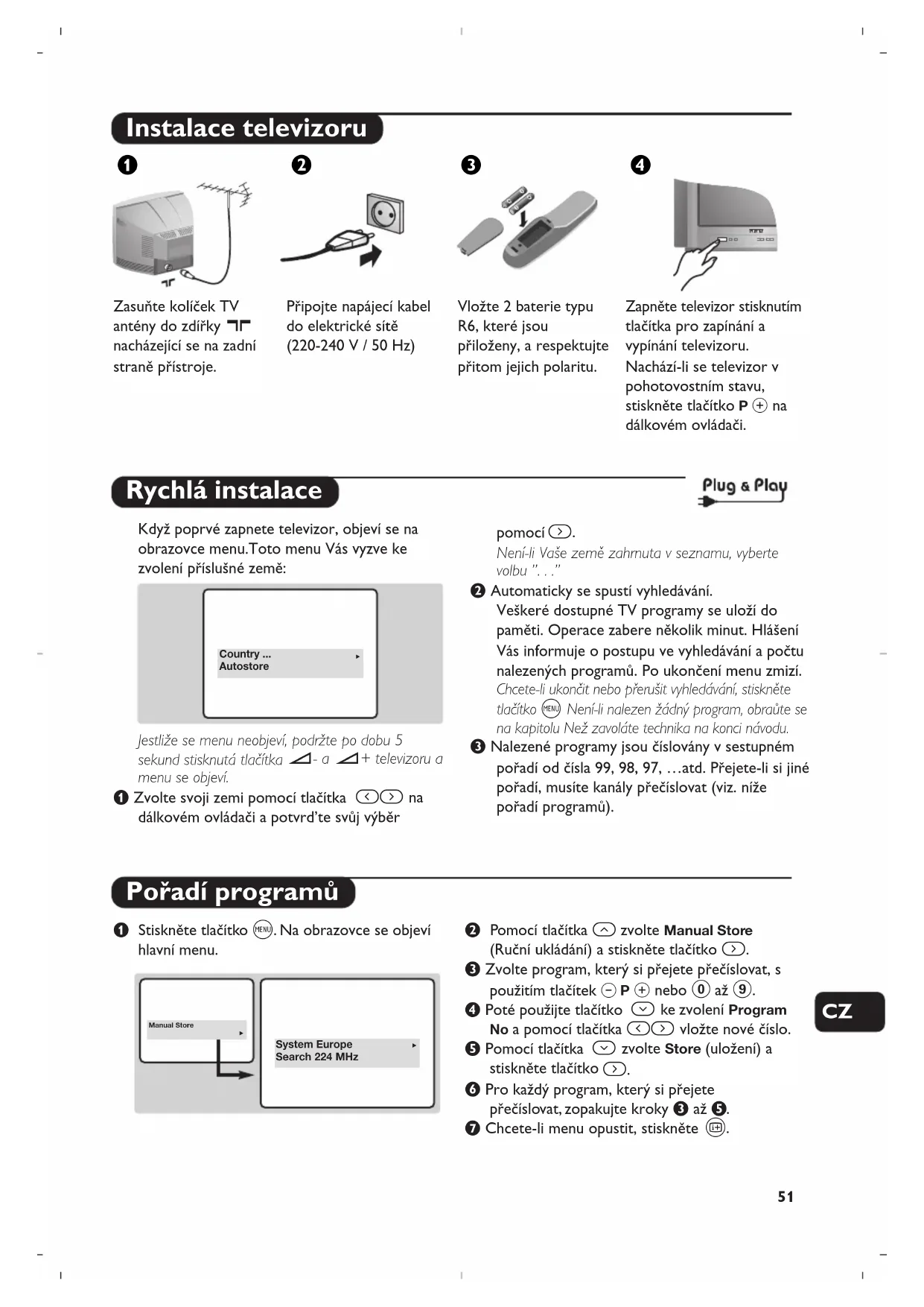 nacházející se na zadní straně přístroje. Připojte napájecí kabel do elektrické sítě (220-240 V / 50 Hz) Vložte 2 baterie typu R6, které jsou přiloženy, a respektujte přitom jejich polaritu. Zapněte televizor stisknutím tlačítka pro zapínání a vypínání televizoru. Nachází-li se televizor v pohotovostním stavu, stiskněte tlačítko P # na dálkovém ovládači. æÂê® Rychlá instalace Pořadí programů Když poprvé zapnete televizor, objeví se na obrazovce menu.Toto menu Vás vyzve ke zvolení příslušné země: Jestliže se menu neobjeví, podržte po dobu 5 sekund stisknutá tlačítka ”- a ”+ televizoru a menu se objeví. & Zvolte svoji zemi pomocí tlačítka Ȭ na dálkovém ovládači a potvrd’te svůj výběr pomocí