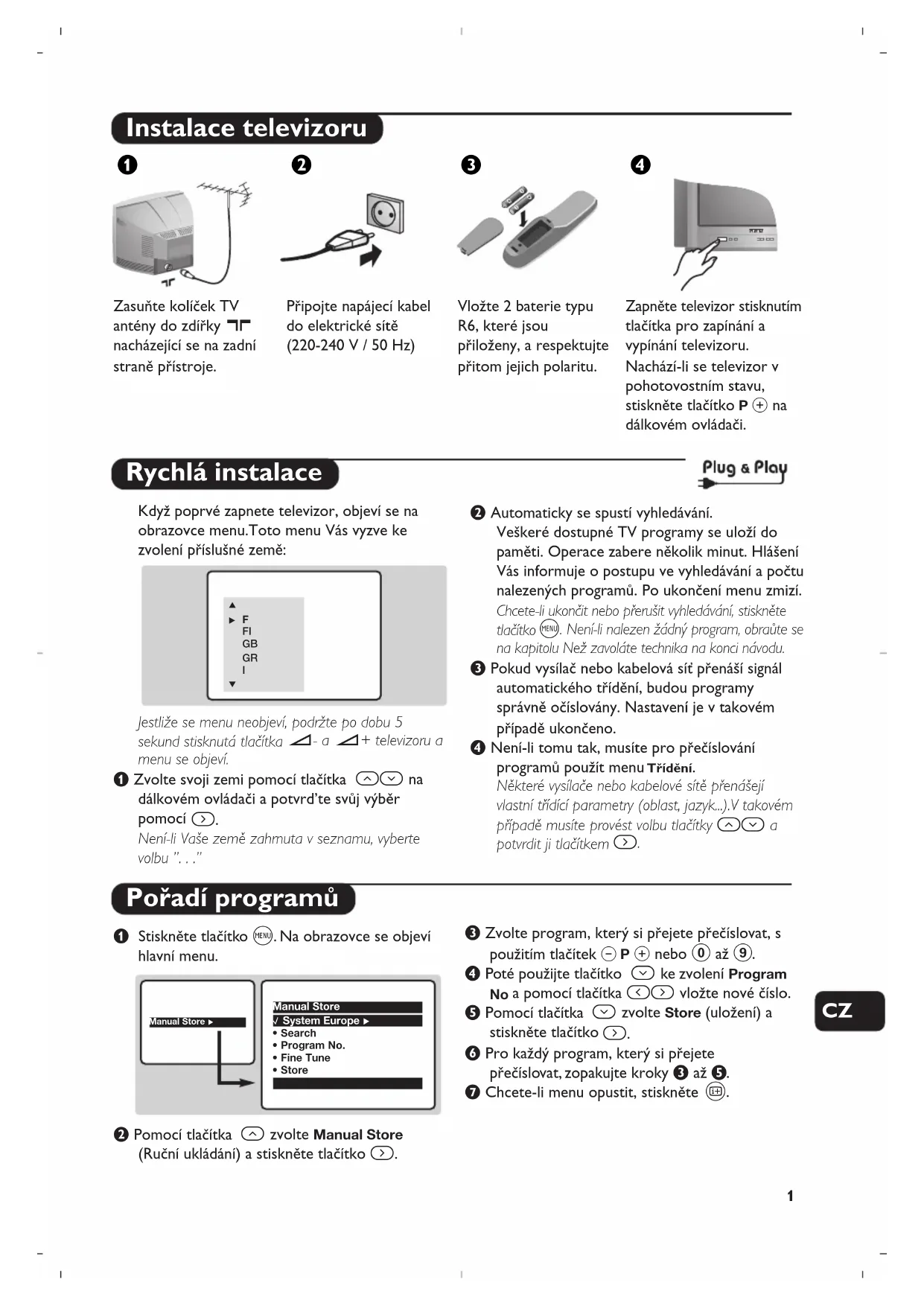 nacházející se na zadní straně přístroje. Připojte napájecí kabel do elektrické sítě (220-240 V / 50 Hz) Vložte 2 baterie typu R6, které jsou přiloženy, a respektujte přitom jejich polaritu. Zapněte televizor stisknutím tlačítka pro zapínání a vypínání televizoru. Nachází-li se televizor v pohotovostním stavu, stiskněte tlačítko P # na dálkovém ovládači. æÂê® Rychlá instalace Pořadí programů Když poprvé zapnete televizor, objeví se na obrazovce menu.Toto menu Vás vyzve ke zvolení příslušné země: Jestliže se menu neobjeví, podržte po dobu 5 sekund stisknutá tlačítka ”- a ”+ televizoru a menu se objeví. & Zvolte svoji zemi pomocí tlačítka îÏ na dálkovém ovládači a potvrd’te svůj výběr pomocí
