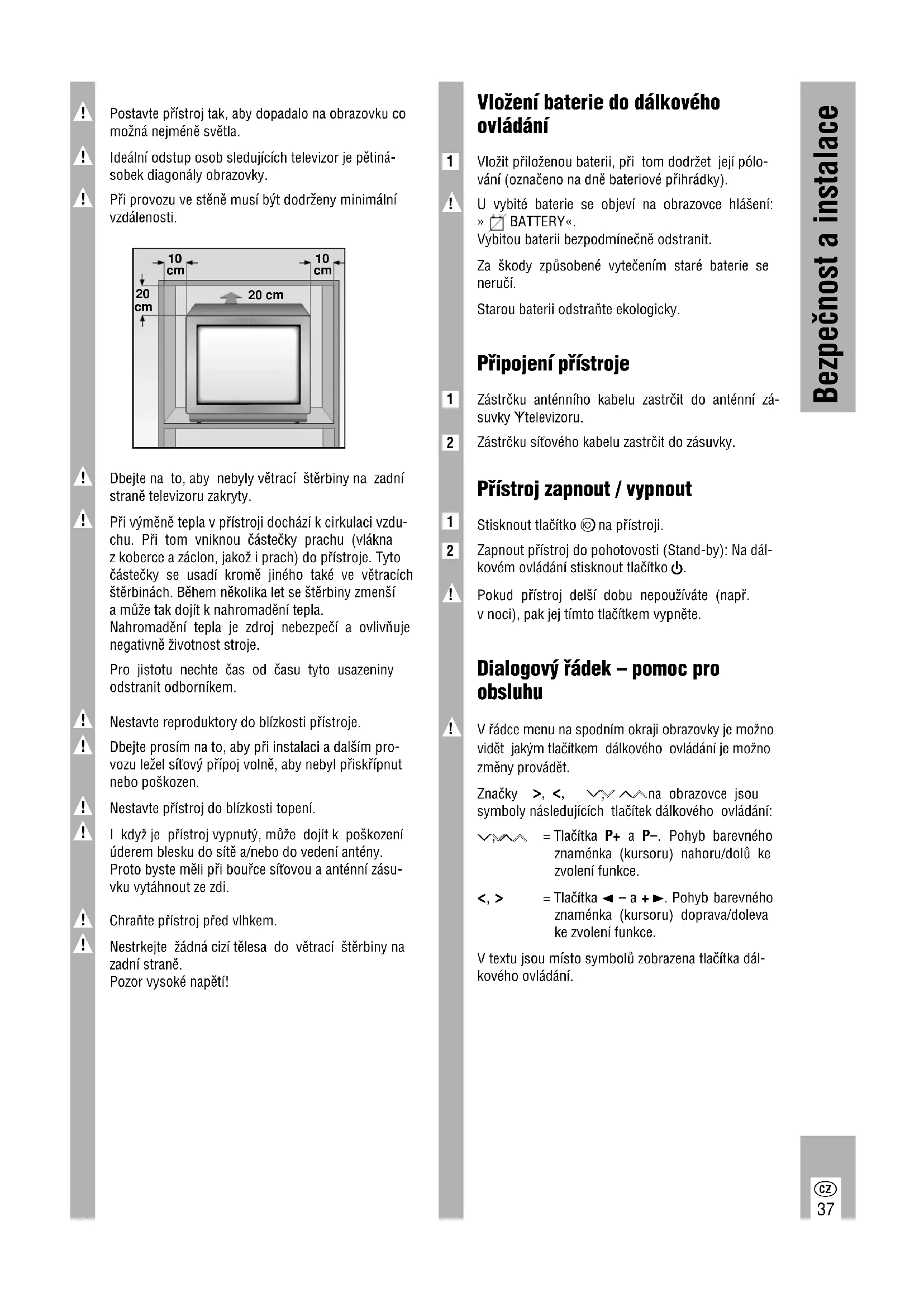 20 cm VloÏení baterie do dálkového ovládání VloÏit pfiiloÏenou baterii, pfii tom dodrÏet její pólo-vání (oznaãeno na dnû bateriové pfiihrádky).