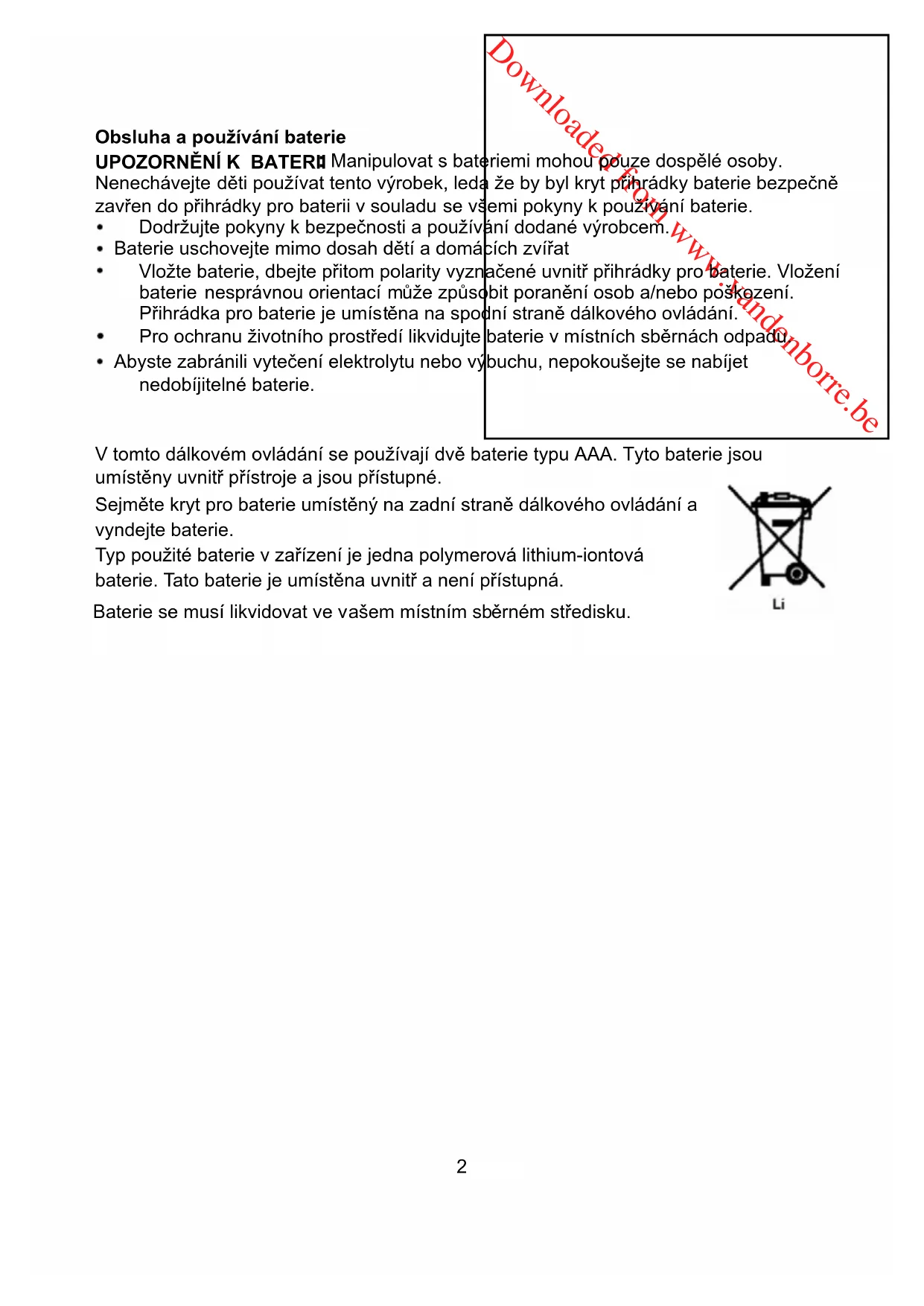 : Manipulovat s bateriemi mohou pouze dospělé osoby. Nenechávejte děti používat tento výrobek, leda že by byl kryt přihrádky baterie bezpečně zavřen do přihrádky pro baterii v souladu se všemi pokyny k používání baterie. Dodržujte pokyny k bezpečnosti a používání dodané výrobcem. Baterie uschovejte mimo dosah dětí a domácích zvířat Vložte baterie, dbejte přitom polarity vyznačené uvnitř přihrádky pro baterie. Vložení baterie nesprávnou orientací může způsobit poranění osob a/nebo poškození. Přihrádka pro baterie je umístěna na spodní straně dálkového ovládání. Pro ochranu životního prostředí likvidujte baterie v místních sběrnách odpadu. Abyste zabránili vytečení elektrolytu nebo výbuchu, nepokoušejte se nabíjet nedobíjitelné baterie. V tomto dálkovém ovládání se používají dvě baterie typu AAA. Tyto baterie jsou umístěny uvnitř přístroje a jsou přístupné. Sejměte kryt pro baterie umístěný na zadní straně dálkového ovládání a vyndejte baterie. Typ použité baterie v zařízení je jedna polymerová lithium-iontová baterie. Tato baterie je umístěna uvnitř a není přístupná. Baterie se musí likvidovat ve vašem místním sběrném středisku.Downloaded from www.vandenborre.be VAROVÁNÍ: Tento výrobek obsahuje laserové zařízení s nízkým výkonem. Neviditelné laserové záření, pokud otevřete a zmizí, pokud uzavřete. Vyhněte se zasažení paprskem.