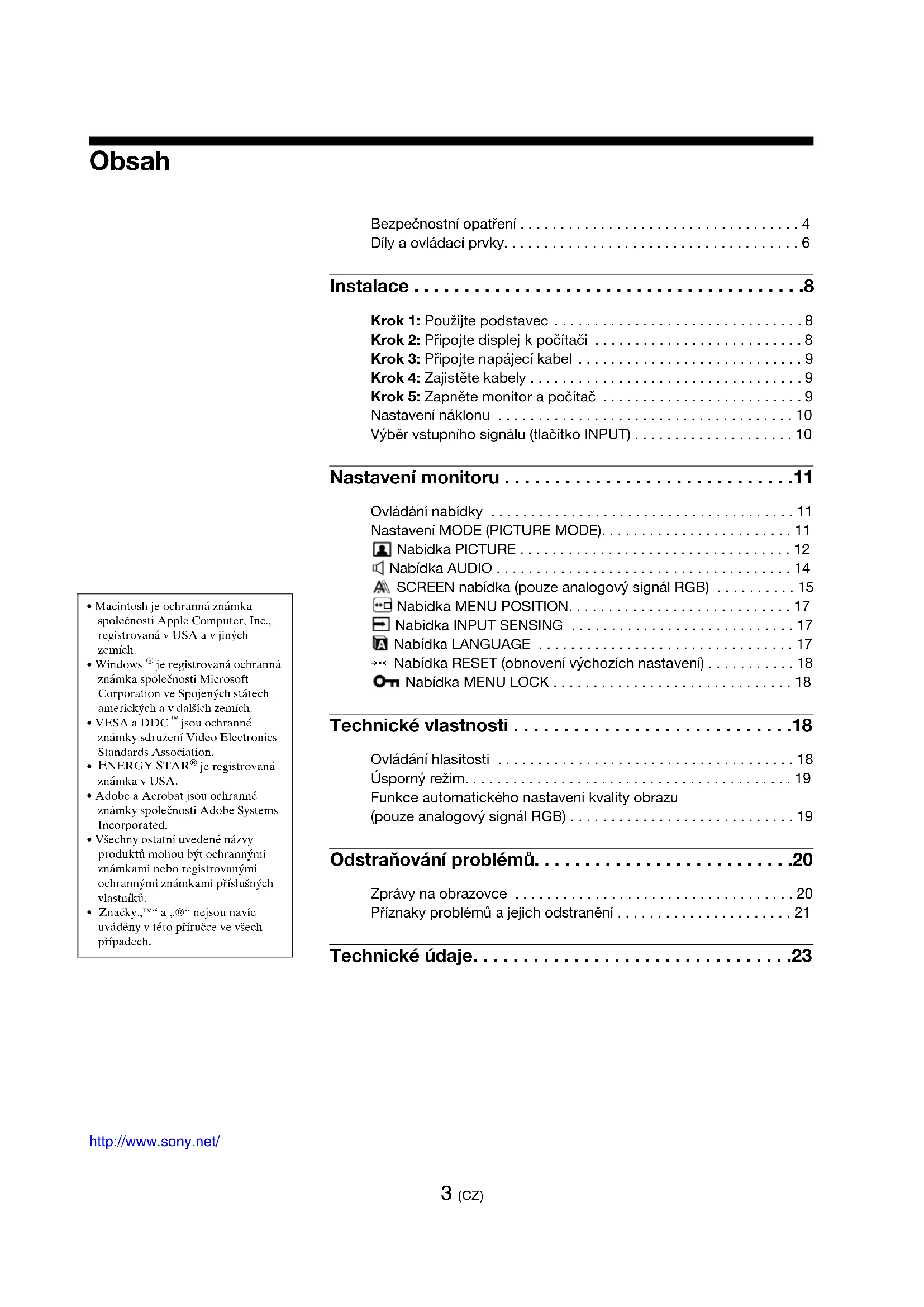 - Značky„™“ a „®“ nejsou navíc uváděny v této příručce ve všech případech. http://www.sony.net/ 3 (CZ) Bezpečnostní opatření . . . . . . . . . . . . . . . . . . . . . . . . . . . . . . . . . . . 4 Díly a ovládací prvky. . . . . . . . . . . . . . . . . . . . . . . . . . . . . . . . . . . . . 6 Instalace . . . . . . . . . . . . . . . . . . . . . . . . . . . . . . . . . . . . . . .8 Krok 1: Použijte podstavec . . . . . . . . . . . . . . . . . . . . . . . . . . . . . . . 8 Krok 2: Připojte displej k počítači . . . . . . . . . . . . . . . . . . . . . . . . . . 8 Krok 3: Připojte napájecí kabel . . . . . . . . . . . . . . . . . . . . . . . . . . . . 9 Krok 4: Zajistěte kabely . . . . . . . . . . . . . . . . . . . . . . . . . . . . . . . . . . 9 Krok 5: Zapněte monitor a počítač . . . . . . . . . . . . . . . . . . . . . . . . . 9 Nastavení náklonu . . . . . . . . . . . . . . . . . . . . . . . . . . . . . . . . . . . . . 10 Výběr vstupního signálu (tlačítko INPUT) . . . . . . . . . . . . . . . . . . . . 10 Nastavení monitoru . . . . . . . . . . . . . . . . . . . . . . . . . . . . .11 Ovládání nabídky . . . . . . . . . . . . . . . . . . . . . . . . . . . . . . . . . . . . . . 11 Nastavení MODE (PICTURE MODE). . . . . . . . . . . . . . . . . . . . . . . . 11 Nabídka PICTURE . . . . . . . . . . . . . . . . . . . . . . . . . . . . . . . . . . 12 Nabídka AUDIO . . . . . . . . . . . . . . . . . . . . . . . . . . . . . . . . . . . . . 14 SCREEN nabídka (pouze analogový signál RGB) . . . . . . . . . . 15 Nabídka MENU POSITION. . . . . . . . . . . . . . . . . . . . . . . . . . . . 17 Nabídka INPUT SENSING . . . . . . . . . . . . . . . . . . . . . . . . . . . . 17 Nabídka LANGUAGE . . . . . . . . . . . . . . . . . . . . . . . . . . . . . . . . 17 0 Nabídka RESET (obnovení výchozích nastavení) . . . . . . . . . . . 18 Nabídka MENU LOCK . . . . . . . . . . . . . . . . . . . . . . . . . . . . . . 18 Technické vlastnosti . . . . . . . . . . . . . . . . . . . . . . . . . . . .18 Ovládání hlasitosti . . . . . . . . . . . . . . . . . . . . . . . . . . . . . . . . . . . . . 18 Úsporný režim. . . . . . . . . . . . . . . . . . . . . . . . . . . . . . . . . . . . . . . . . 19 Funkce automatického nastavení kvality obrazu (pouze analogový signál RGB) . . . . . . . . . . . . . . . . . . . . . . . . . . . . 19 Odstraňování problémů. . . . . . . . . . . . . . . . . . . . . . . . . .20 Zprávy na obrazovce . . . . . . . . . . . . . . . . . . . . . . . . . . . . . . . . . . . 20 Příznaky problémů a jejich odstranění . . . . . . . . . . . . . . . . . . . . . . 21 Technické údaje. . . . . . . . . . . . . . . . . . . . . . . . . . . . . . . .234 (CZ) Bezpečnostní opatření Upozornění týkající se napájení