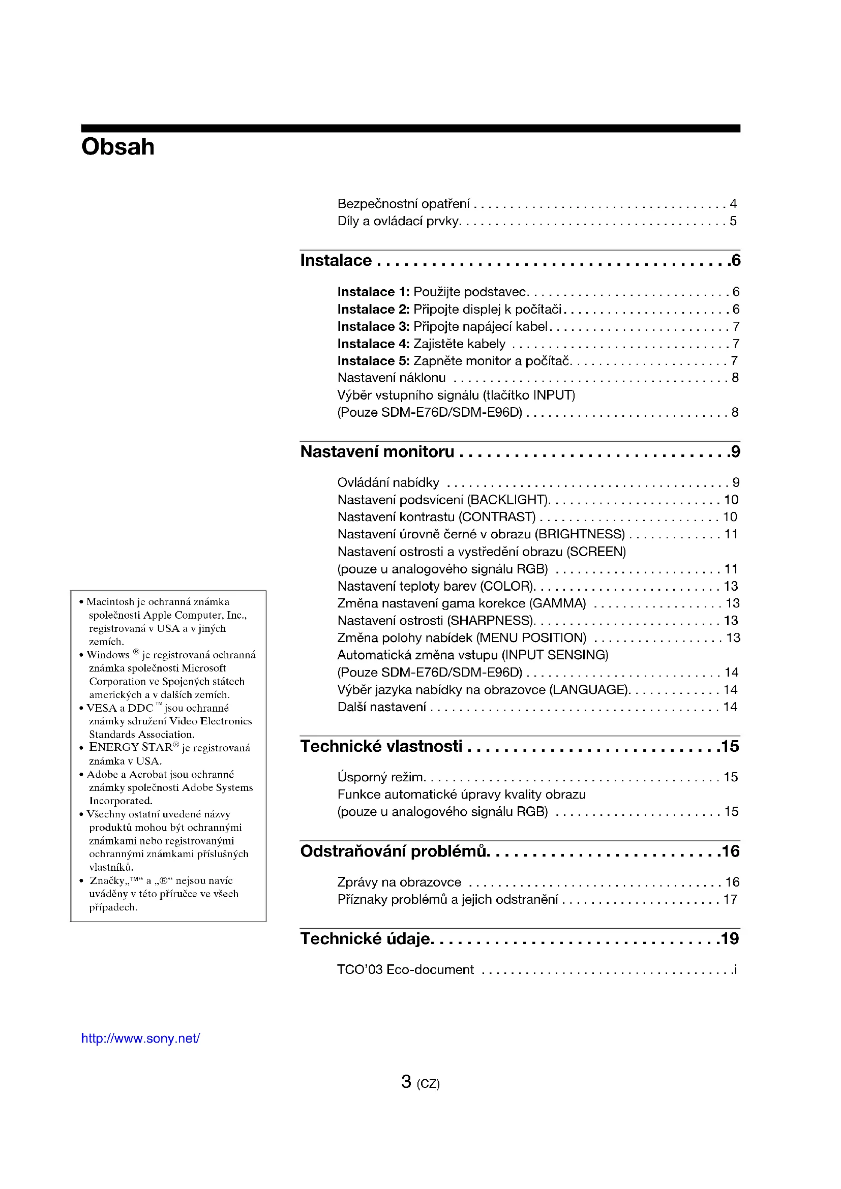 - Značky„™“ a „®“ nejsou navíc uváděny v této příručce ve všech případech. http://www.sony.net/ 3 (CZ) Bezpečnostní opatření . . . . . . . . . . . . . . . . . . . . . . . . . . . . . . . . . . . 4 Díly a ovládací prvky. . . . . . . . . . . . . . . . . . . . . . . . . . . . . . . . . . . . . 5 Instalace . . . . . . . . . . . . . . . . . . . . . . . . . . . . . . . . . . . . . . .6 Instalace 1: Použijte podstavec. . . . . . . . . . . . . . . . . . . . . . . . . . . . 6 Instalace 2: Připojte displej k počítači. . . . . . . . . . . . . . . . . . . . . . . 6 Instalace 3: Připojte napájecí kabel. . . . . . . . . . . . . . . . . . . . . . . . . 7 Instalace 4: Zajistěte kabely . . . . . . . . . . . . . . . . . . . . . . . . . . . . . . 7 Instalace 5: Zapněte monitor a počítač. . . . . . . . . . . . . . . . . . . . . . 7 Nastavení náklonu . . . . . . . . . . . . . . . . . . . . . . . . . . . . . . . . . . . . . . 8 Výběr vstupního signálu (tlačítko INPUT) (Pouze SDM-E76D/SDM-E96D) . . . . . . . . . . . . . . . . . . . . . . . . . . . . 8 Nastavení monitoru . . . . . . . . . . . . . . . . . . . . . . . . . . . . . .9 Ovládání nabídky . . . . . . . . . . . . . . . . . . . . . . . . . . . . . . . . . . . . . . . 9 Nastavení podsvícení (BACKLIGHT). . . . . . . . . . . . . . . . . . . . . . . . 10 Nastavení kontrastu (CONTRAST) . . . . . . . . . . . . . . . . . . . . . . . . . 10 Nastavení úrovně černé v obrazu (BRIGHTNESS) . . . . . . . . . . . . . 11 Nastavení ostrosti a vystředění obrazu (SCREEN) (pouze u analogového signálu RGB) . . . . . . . . . . . . . . . . . . . . . . . 11 Nastavení teploty barev (COLOR). . . . . . . . . . . . . . . . . . . . . . . . . . 13 Změna nastavení gama korekce (GAMMA) . . . . . . . . . . . . . . . . . . 13 Nastavení ostrosti (SHARPNESS). . . . . . . . . . . . . . . . . . . . . . . . . . 13 Změna polohy nabídek (MENU POSITION) . . . . . . . . . . . . . . . . . . 13 Automatická změna vstupu (INPUT SENSING) (Pouze SDM-E76D/SDM-E96D) . . . . . . . . . . . . . . . . . . . . . . . . . . . 14 Výběr jazyka nabídky na obrazovce (LANGUAGE). . . . . . . . . . . . . 14 Další nastavení . . . . . . . . . . . . . . . . . . . . . . . . . . . . . . . . . . . . . . . . 14 Technické vlastnosti . . . . . . . . . . . . . . . . . . . . . . . . . . . .15 Úsporný režim. . . . . . . . . . . . . . . . . . . . . . . . . . . . . . . . . . . . . . . . . 15 Funkce automatické úpravy kvality obrazu (pouze u analogového signálu RGB) . . . . . . . . . . . . . . . . . . . . . . . 15 Odstraňování problémů. . . . . . . . . . . . . . . . . . . . . . . . . .16 Zprávy na obrazovce . . . . . . . . . . . . . . . . . . . . . . . . . . . . . . . . . . . 16 Příznaky problémů a jejich odstranění . . . . . . . . . . . . . . . . . . . . . . 17 Technické údaje. . . . . . . . . . . . . . . . . . . . . . . . . . . . . . . .19 TCO’03 Eco-document . . . . . . . . . . . . . . . . . . . . . . . . . . . . . . . . . . .i4 (CZ) Bezpečnostní opatření Upozornění týkající se napájení