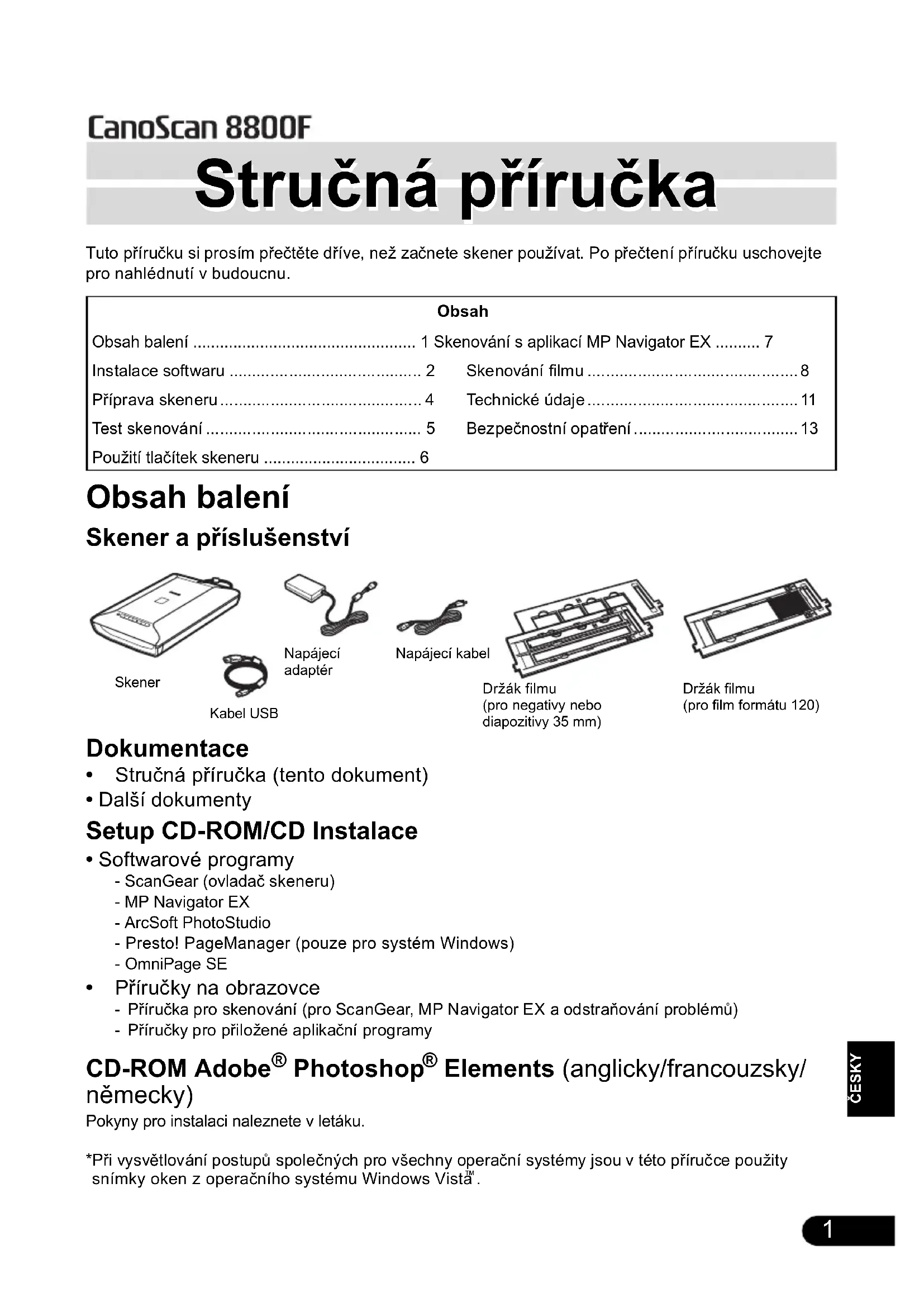 Elements (anglicky/francouzsky/ německy) Pokyny pro instalaci naleznete v letáku. *Při vysvětlování postupů společných pro všechny operační systémy jsou v této příručce použity snímky oken z operačního systému Windows Vista