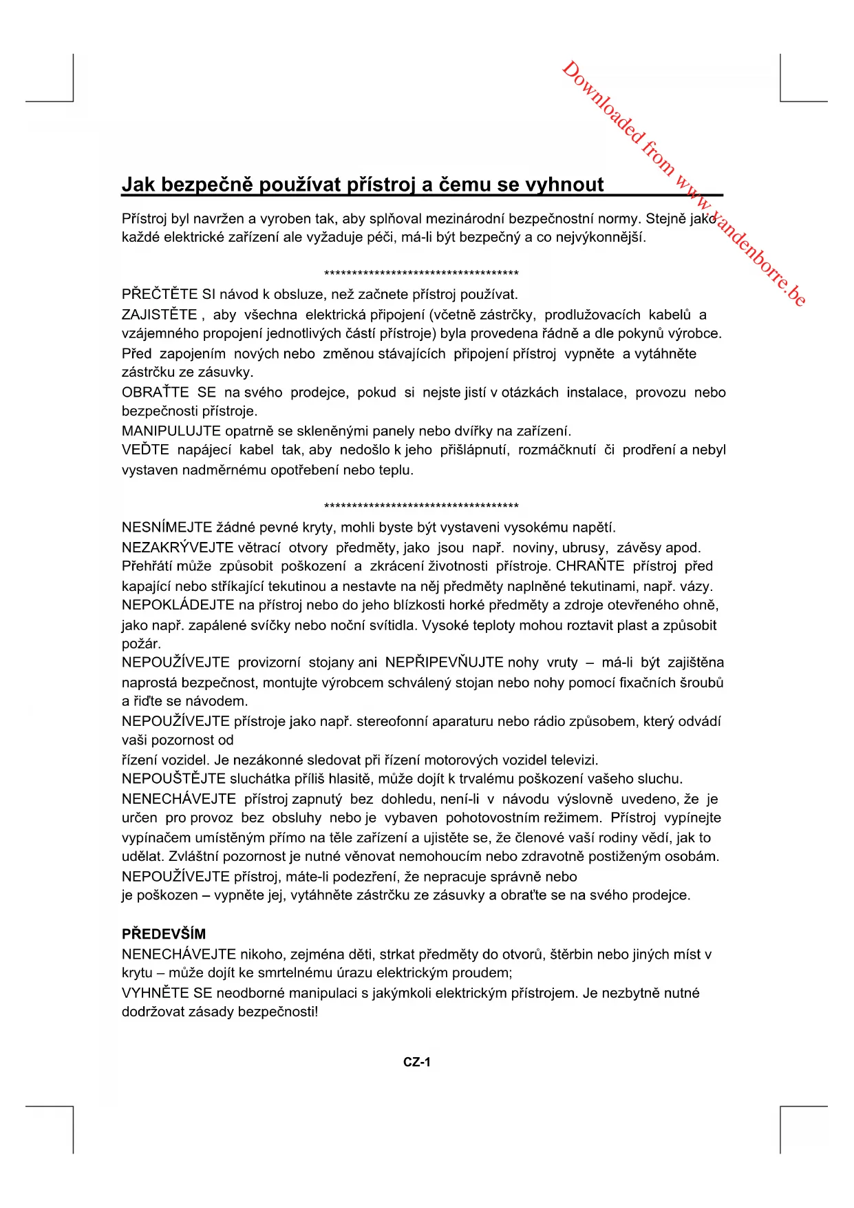 NENECHÁVEJTE nikoho, zejména děti, strkat předměty do otvorů, štěrbin nebo jiných míst v krytu – může dojít ke smrtelnému úrazu elektrickým proudem; VYHNĚTE SE neodborné manipulaci s jakýmkoli elektrickým přístrojem. Je nezbytně nutné dodržovat zásady bezpečnosti! Downloaded from www.vandenborre.beCZ-2