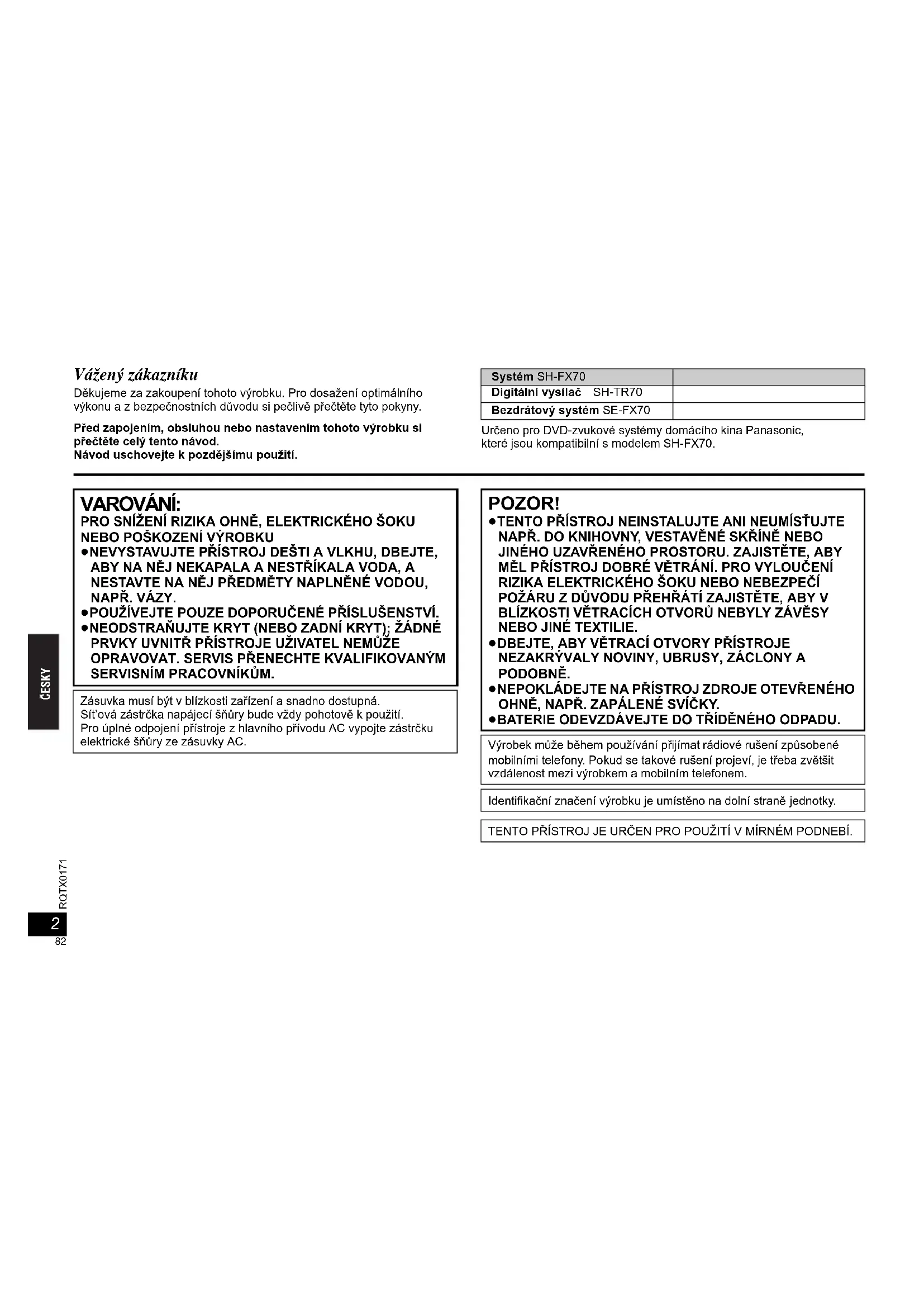 RQTX0171 CESKY Vážený zákazníku Děkujeme za zakoupení tohoto výrobku. Pro dosažení optimálního výkonu a z bezpečnostních důvodu si pečlivě přečtěte tyto pokyny. Před zapojením, obsluhou nebo nastavením tohoto výrobku si přečtěte celý tento návod. Návod uschovejte k pozdějšímu použití. Určeno pro DVD-zvukové systémy domácího kina Panasonic, které jsou kompatibilní s modelem SH-FX70.Systém SH-FX70Digitální vysílač SH-TR70Bezdrátový systém SE-FX70 VAROVÁNÍ: PRO SNÍŽENÍ RIZIKA OHNĚ, ELEKTRICKÉHO ŠOKU