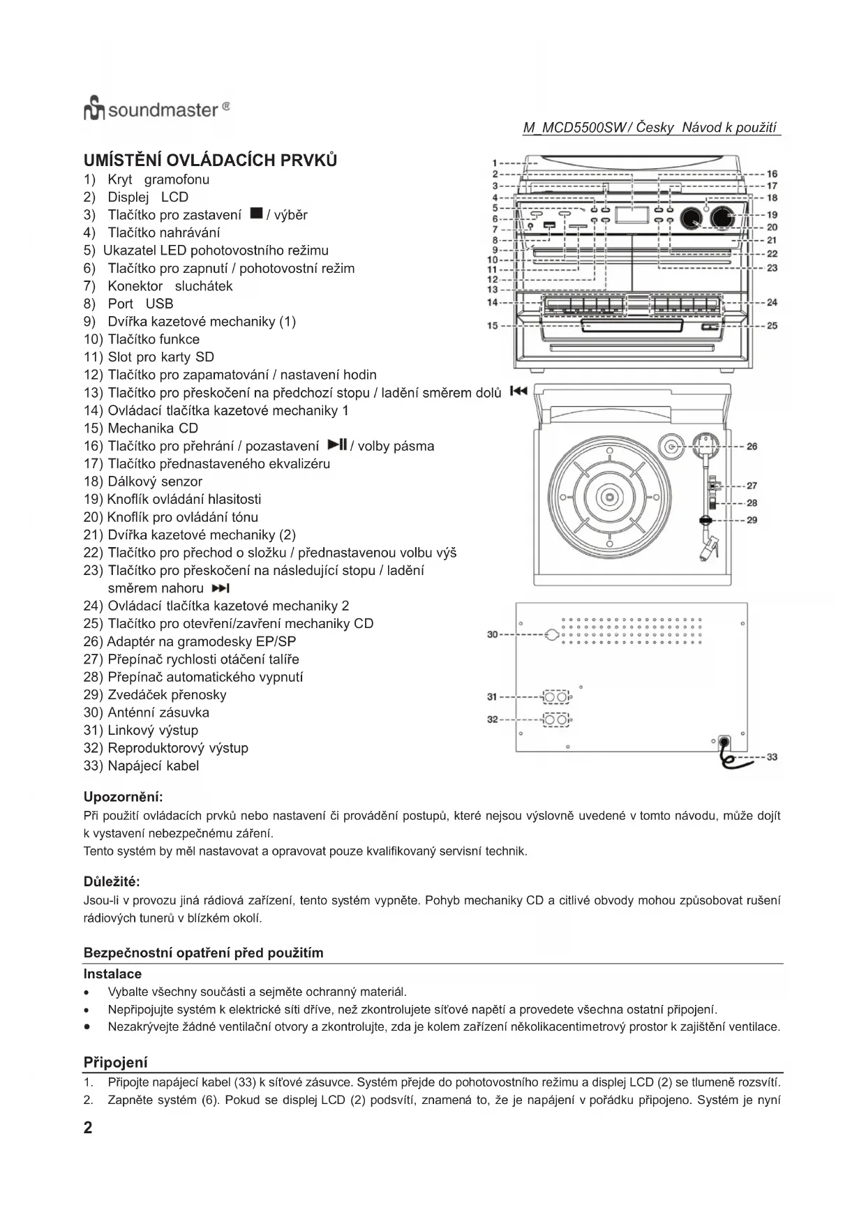 UpozornČQí: 3Ĝi pouåití ovládacích prvkĤ nebo nastavení þi provádČní postXSĤ, které nejsou výslovnČ uvedené v tomto návodu, mĤåe dojít k vystavení nebezpeþnému záĜení. Tento systém by mČl nastavovat a opravovat pouze kvalifikovaný servisní technik. DĤleåité: Jsou-li v provozu jiná rádiová zaĜízení, tento systém vypQČte. Pohyb mechaniky CD a citlivé obvody mohou zpĤsobovat rušení rádiových tunerĤ v blízkém okolí. Bezpeþnostní opatĜHQí pĜHG pouåitím Instalace x Vybalte všechny souþásti a sejmČte ochranný materiál. x NepĜipojujte systém k elektrické síti dĜíve, neå zkontrolujete síĢové naSČtí a provedete všechna ostatní pĜipojení. x Nezakrývejte åádné ventilaþní otvory a zkontrolujte, zda je kolem zaĜízení QČkolikacentimetrový prostor k zajištČQí ventilace. PĜipojení 1. 3Ĝipojte napájecí kabel (33) k síĢové zásuvce. Systém pĜejde do pohotovostního reåimu a displej LCD (2) se tlumeQČ rozsvítí. 2. ZDSQČte systém (6). Pokud se displej LCD (2) podsvítí, znamená to, åe je napájení v poĜádku pĜipojeno. Systém je nyníM_MCD5500SW