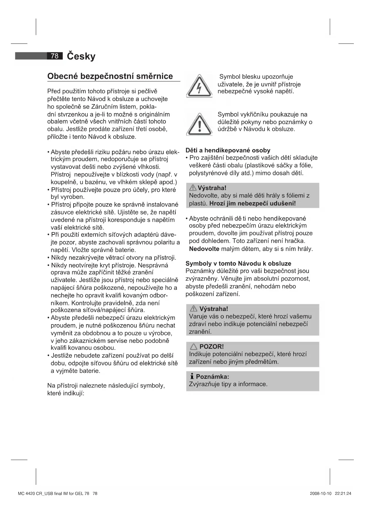 - Ujistěte se, že napětí elektrické sítě korespon- duje s hodnotami uvedenými na štítku. Vložení baterie Poznámka: Lithiový článek ve schránce na baterie dálkového ovladače je deaktivován vložením fólie mezi elektrody během dopravy. Tímto se prodlužuje doba používání baterie. Před prvním použitím vyjměte tuto fólii, abyste baterii aktivovali. Baterie v dálkovém ovladači je lithiový článek s prodlouženou životností. Jestliže se během používání dálkového ovladače zkracuje jeho dosah, postupujte následujícím způsobem: Česky MC 4420 CR_USB final IM for GEL 79 79MC 4420 CR_USB final IM for GEL 79 79 2008-10-10 22:21:272008-10-10 22:21:2780