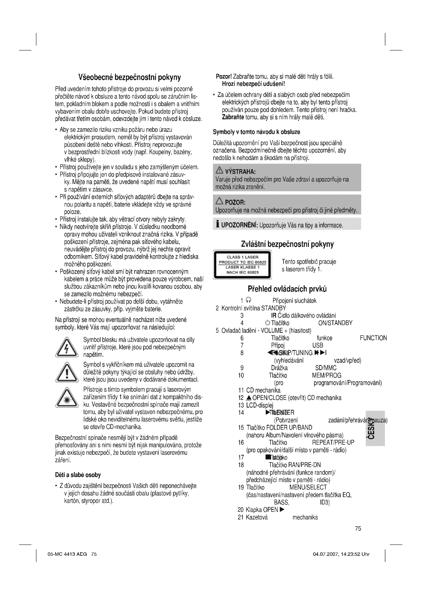 OPEN/ CLOSE (otevřít) (12). Před uvedením do provozu odstraňte z přehrávače eventuálně vloženou transportní pojistku. 05-MC 4413 AEG 76 04.07.2007, 14:23:54 UhrČESKY