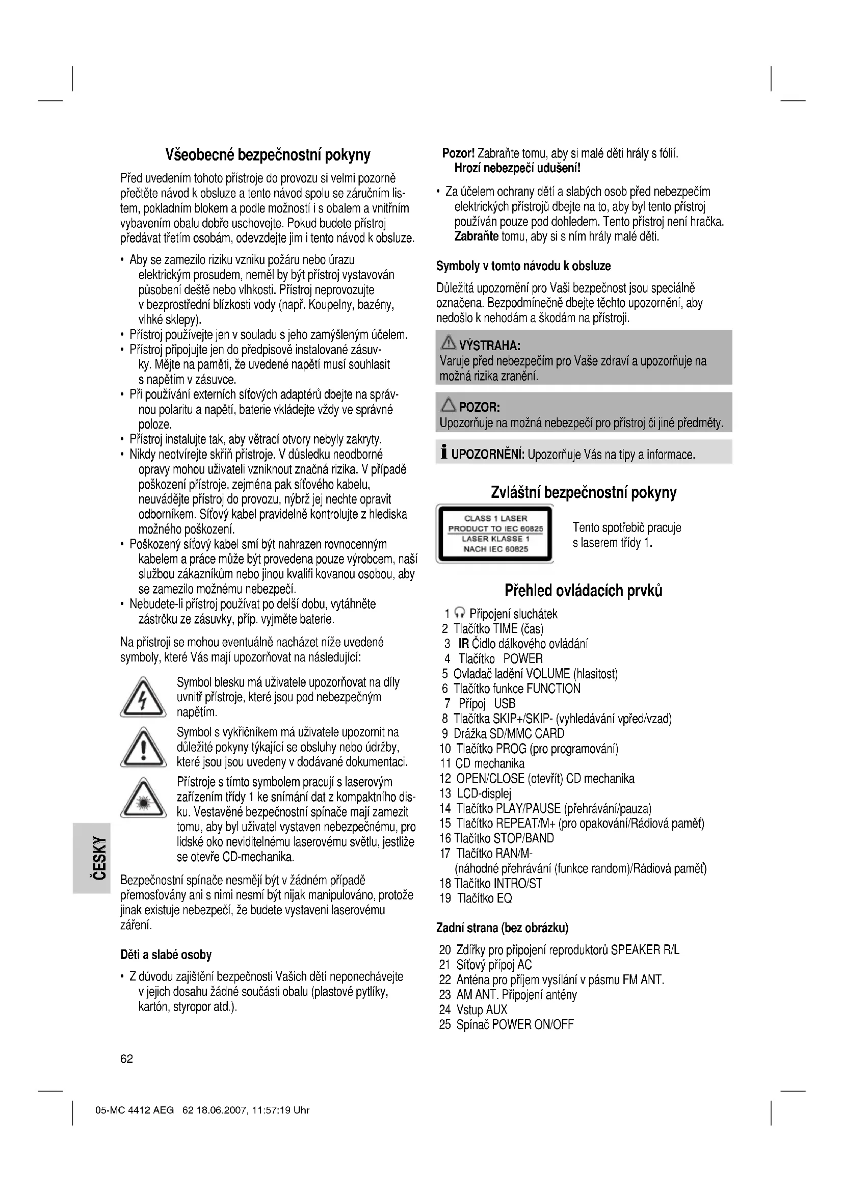 - Za účelem ochrany dětí a slabých osob před nebezpečím elektrických přístrojů dbejte na to, aby byl tento přístroj používán pouze pod dohledem. Tento přístroj není hračka. Zabraňte tomu, aby si s ním hrály malé děti. Symboly v tomto návodu k obsluze Důležitá upozornění pro Vaši bezpečnost jsou speciálně označena. Bezpodmínečně dbejte těchto upozornění, aby nedošlo k nehodám a škodám na přístroji. VÝSTRAHA: Varuje před nebezpečím pro Vaše zdraví a upozorňuje na možná rizika zranění. POZOR: Upozorňuje na možná nebezpečí pro přístroj či jiné předměty. UPOZORNĚNÍ: Upozorňuje Vás na tipy a informace. Zvláštní bezpečnostní pokyny Tento spotřebič pracuje s laserem třídy 1. Přehled ovládacích prvků 1 Připojení sluchátek 2 Tlačítko TIME (čas) 3 IR Čidlo dálkového ovládání 4 Tlačítko POWER 5 Ovladač ladění VOLUME (hlasitost) 6 Tlačítko funkce FUNCTION 7 Přípoj USB 8 Tlačítka SKIP+/SKIP- (vyhledávání vpřed/vzad) 9 Drážka SD/MMC CARD 10 Tlačítko PROG (pro programování) 11 CD mechanika 12 OPEN/CLOSE (otevřít) CD mechanika 13 LCD-displej 14 Tlačítko PLAY/PAUSE (přehrávání/pauza) 15 Tlačítko REPEAT/M+ (pro opakování/Rádiová paměť) 16 Tlačítko STOP/BAND 17 Tlačítko RAN/M- (náhodné přehrávání (funkce random)/Rádiová paměť) 18 Tlačítko INTRO/ST 19 Tlačítko EQ Zadní strana (bez obrázku) 20 Zdířky pro připojení reproduktorů SPEAKER R/L 21 Síťový přípoj AC 22 Anténa pro příjem vysílání v pásmu FM ANT. 23 AM ANT. Připojení antény 24 Vstup AUX 25 Spínač POWER ON/OFF 05-MC 4412 AEG 62 18.06.2007, 11:57:19 UhrČESKY