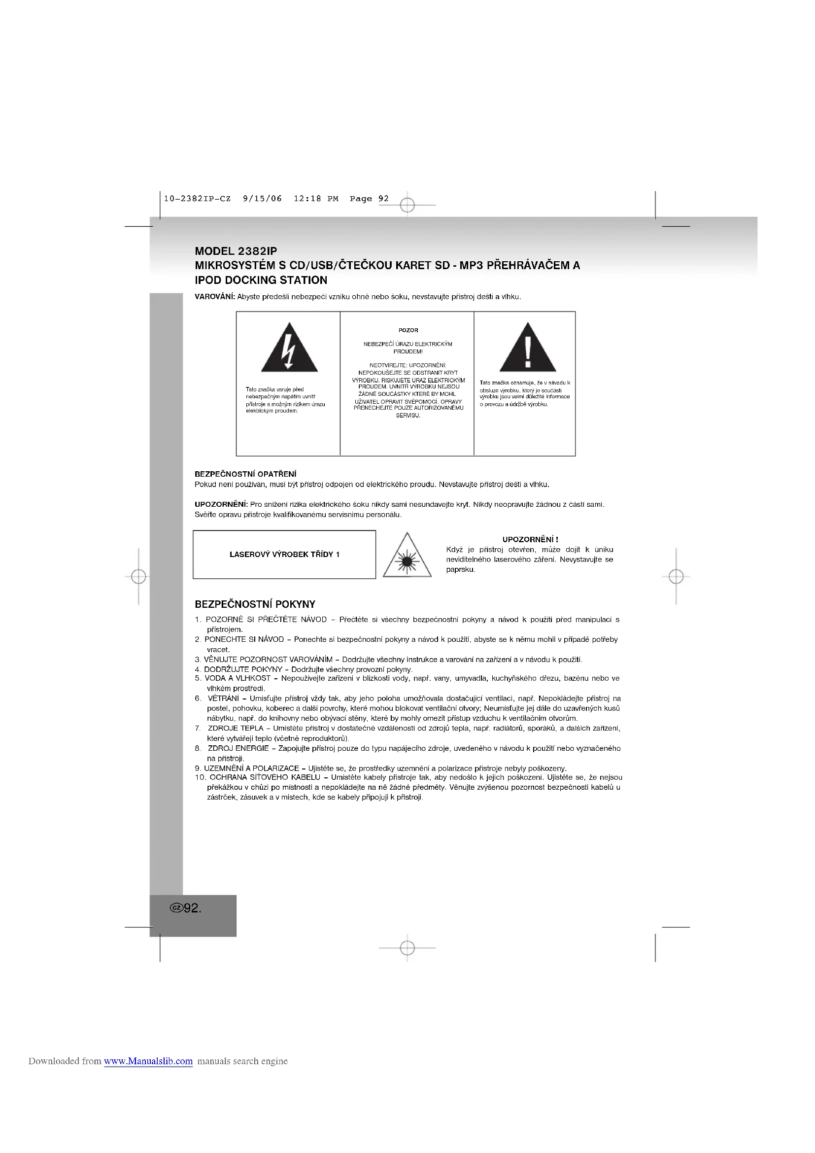 LASEROVÝ VÝROBEK TŘÍDY 1UPOZORNĚNÍ !Když je přístroj otevřen, může dojít k únikuneviditelného laserového záření. Nevystavujte sepaprsku.Tato značka varuje přednebezpečným napětím uvnitřpřístroje a možným rizikem úrazuelektrickým proudem.POZORNEBEZPEČÍ ÚRAZU ELEKTRICKÝMPROUDEM!NEOTVÍREJTE: UPOZORNĚNÍ:NEPOKOUŠEJTE SE ODSTRANIT KRYTVÝROBKU, RISKUJETE ÚRAZ ELEKTRICKÝMPROUDEM. UVNITŘ VÝROBKU NEJSOUŽÁDNÉ SOUČÁSTKY KTERÉ BY MOHLUŽIVATEL OPRAVIT SVÉPOMOCÍ. OPRAVYPŘENECHEJTE POUZE AUTORIZOVANÉMUSERVISU.Tato značka oznamuje, že v návodu kobsluze výrobku, který je součástívýrobku jsou velmi důležité informaceo provozu a údržbě výrobku.10-2382IP-CZ 9/15/06 12:18 PM Page 92 Downloaded from www.Manualslib.com manuals search engine11. ČIŠTĚNÍ – Přístroj by měl být čištěn pouze podle instrukcí výrobce.12. ELEKTRICKÉ VEDENÍ – Umístěte venkovní anténu mimo elektrické vedení. 13. KDYŽ PŘÍSTROJ NEPOUŽÍVÁTE – Síťový kabel přístroje by měl být odpojen ze sítě pokud není přístroj delší dobu používán.