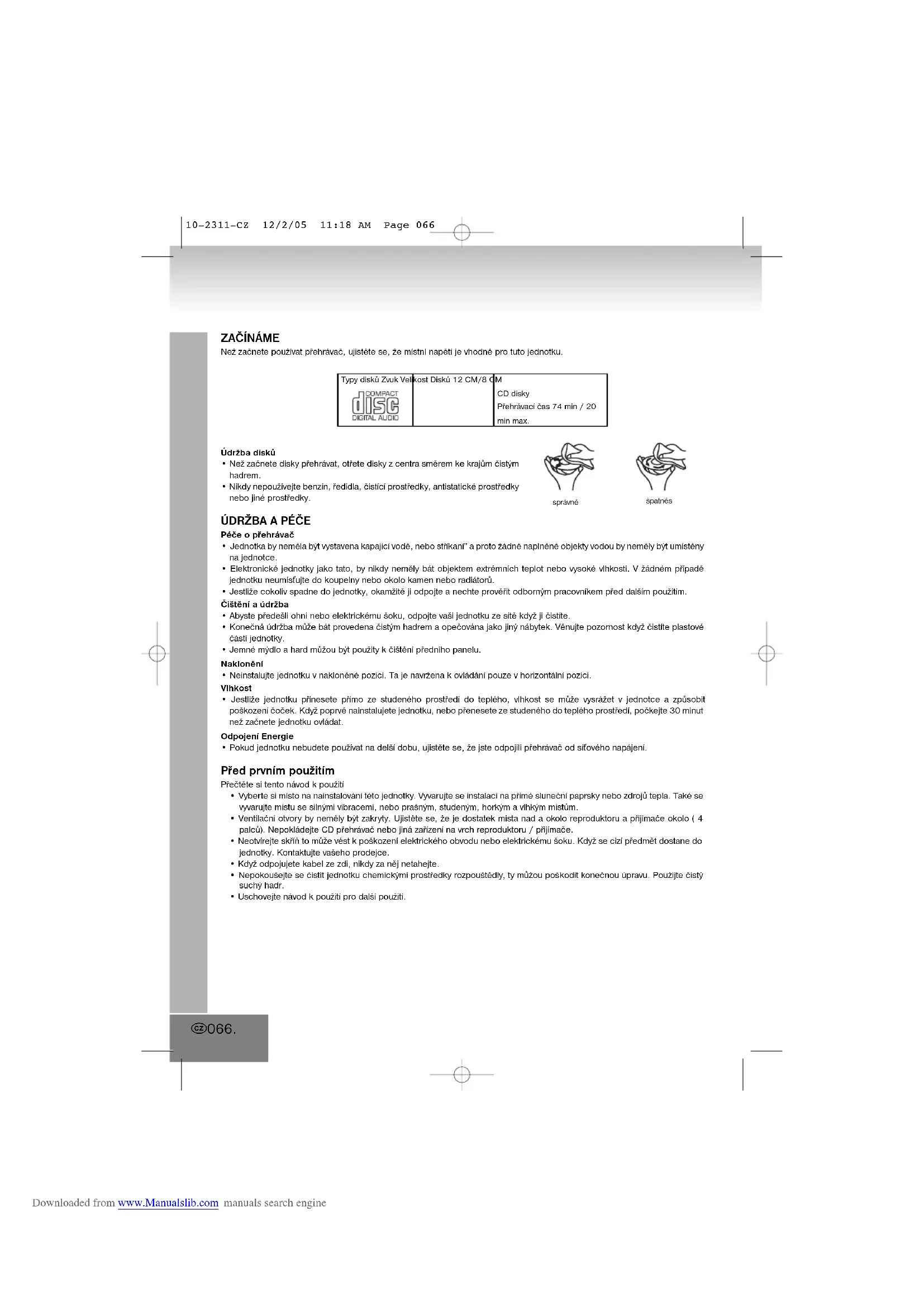 - Nepokoušejte se čistit jednotku chemickými prostředky rozpouštědly, ty můžou poškodit konečnou úpravu. Použijte čistý suchý hadr.• Uschovejte návod k použití pro další použití. Typy disků Zvuk Velikost Disků 12 CM/8 CMCD diskyPřehrávací čas 74 min / 20min max.správněšpatněs 10-2311-CZ 12/2/05 11:18 AM Page 066 Downloaded from www.Manualslib.com manuals search engine 067. VAROVÁNÍ: ABYSTE PŘEDEŠLI POŽÁRU NEBO EL. ŠOKU, NEVYSTAVUJTE ZAŘÍZENÍ KAPKÁM VODY NEBOSTŘÍKANCŮM.Poznámka: Tato jednotka se zahřívá při delším časovém provozu. To je v pořádku a to neznamená žádný problém s jednotkou. Tento CD přehrávač obsahuje mikro-procesor, který se může porouchat v důsledku extrémního elektrického rušení nebo šoku. Nepracuje-li CD přehrávač řádně, odpojte kabel a opět jej zapojte. Okno SENZORU přijímače Poznámka: