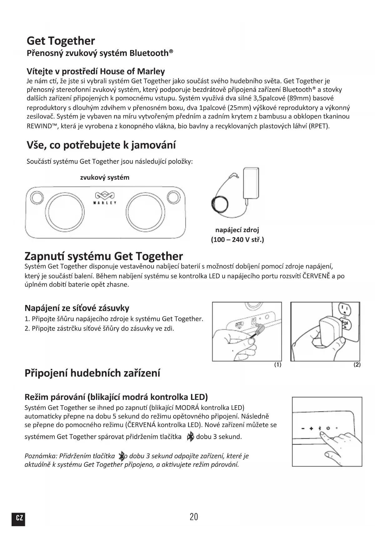 WEEE forklaring Denne afmarkning angiver, at dette produkt ikke ma bortskaffes med andet husholdningsaffald inden for EU. For at forhindre mulig skade for miljoet eller menneskers sundhed pa grund af ukontrolleret affaldsbortskaffelse, skal det genanvendes pa ansvarlig vis for at fremme den baredygtige genanvendelse af materielle ressourcer. Gor brug af returnerings- og indsamlingssystemer eller kontakt den detailhandler, hvor produktet blev kobt, for at returnere det brugte produkt. Disse kan videresende produktet til miljosikker genanvendelse. BATTERIDIREKTIV Dette symbol indikerer, at batterier ikke ma bortskaffes med husholdningsaffald, da de indeholder stoffer, der kan vare miljo- og helbredsskadelige. Bortskaf venligst batterier pa udpegede indsamlingssteder. DK20 Get Together Přenosný zvukový systém Bluetooth® Vítejte v prostředí House of Marley Je nám c, že jste si vybrali systém Get Together jako součást svého hudebního světa. Get Together je přenosný stereofonní zvukový systém, který podporuje bezdrátově připojená zařízení Bluetooth® a stovky dalších zařízení připojených k pomocnému vstupu. Systém využívá dva silné 3,5palcové (89mm) basové reproduktory s dlouhým zdvihem v přenosném boxu, dva 1palcové (25mm) výškové reproduktory a výkonný zesilovač. Systém je vybaven na míru vytvořeným předním a zadním krytem z bambusu a obklopen tkaninou REWIND™, která je vyrobena z konopného vlákna, bio bavlny a recyklovaných plastových láhví (RPET). Vše, co potřebujete k jamování Součás systému Get Together jsou následující položky: zvukový systém napájecí zdroj (100 – 240 V stř.) Zapnu systému Get Together Systém Get Together disponuje vestavěnou nabíjecí baterií s možnos dobíjení pomocí zdroje napájení, který je součás balení. Během nabíjení systému se kontrolka LED u napájecího portu rozsví ČERVENĚ a po úplném dobi baterie opět zhasne. Napájení ze síťové zásuvky