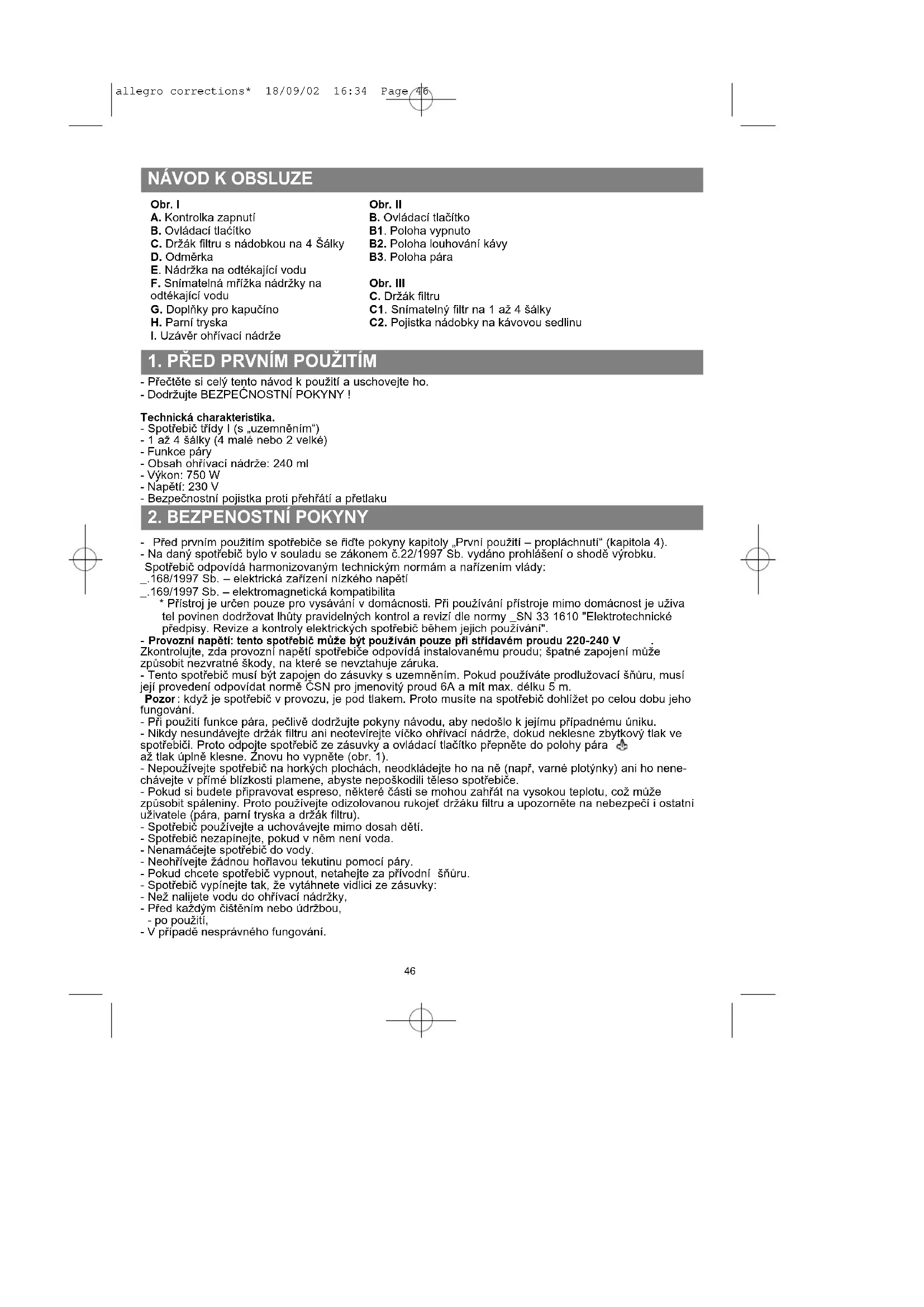 - Přečtěte si celý tento návod k použití a uschovejte ho. - Dodržujte BEZPEĆNOSTNÍ POKYNY ! Technická charakteristika. - Spotřebič třídy I (s „uzemněním“) - 1 až 4 šálky (4 malé nebo 2 velké) - Funkce páry - Obsah ohřívací nádrže: 240 ml - Výkon: 750 W - Napětí: 230 V - Bezpečnostní pojistka proti přehřátí a přetlaku