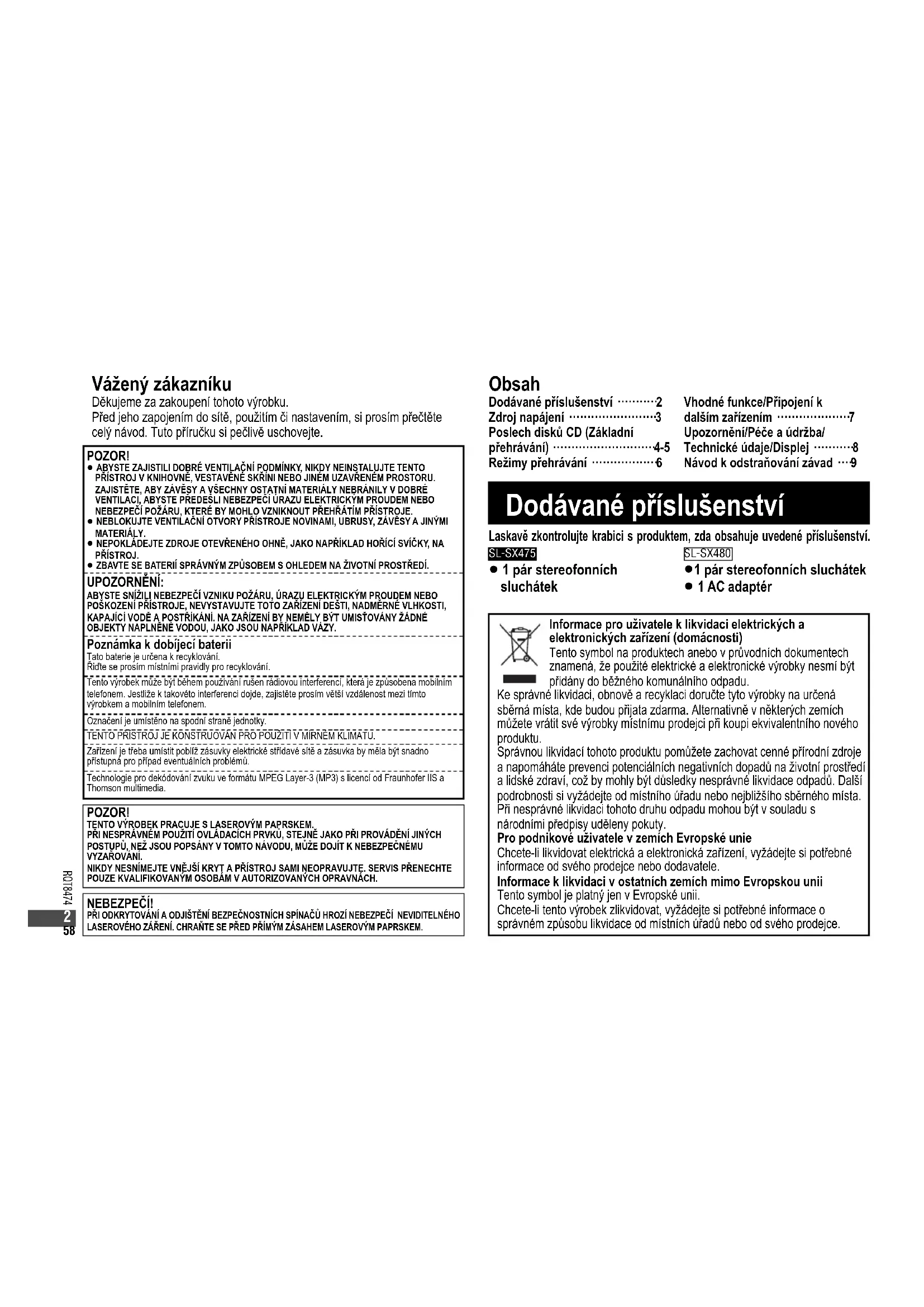 RQT8474-EPr.indd57RQT8474-EPr.indd57 2005/11/0715:27:362005/11/0715:27:3658 RQT8474 Informace pro uživatele k likvidaci elektrických a elektronických zařízení (domácnosti) Tento symbol na produktech anebo v průvodních dokumentech znamená, že použité elektrické a elektronické výrobky nesmí být přidány do běžného komunálního odpadu. Ke správné likvidaci, obnově a recyklaci doručte tyto výrobky na určená sběrná místa, kde budou přijata zdarma. Alternativně v některých zemích můžete vrátit své výrobky místnímu prodejci při koupi ekvivalentního nového produktu. Správnou likvidací tohoto produktu pomůžete zachovat cenné přírodní zdroje a napomáháte prevenci potenciálních negativních dopadů na životní prostředí a lidské zdraví, což by mohly být důsledky nesprávné likvidace odpadů. Další podrobnosti si vyžádejte od místního úřadu nebo nejbližšího sběrného místa. Při nesprávné likvidaci tohoto druhu odpadu mohou být v souladu s národními předpisy uděleny pokuty. Pro podnikové uživatele v zemích Evropské unie Chcete-li likvidovat elektrická a elektronická zařízení, vyžádejte si potřebné informace od svého prodejce nebo dodavatele. Informace k likvidaci v ostatních zemích mimo Evropskou unii Tento symbol je platný jen v Evropské unii. Chcete-li tento výrobek zlikvidovat, vyžádejte si potřebné informace o správném způsobu likvidace od místních úřadů nebo od svého prodejce. Dodávané příslušenství POZOR! p ABYSTE ZAJISTILI DOBRÉ VENTILAČNÍ PODMÍNKY, NIKDY NEINSTALUJTE TENTO PŘÍSTROJ V KNIHOVNĚ, VESTAVĚNÉ SKŘÍNI NEBO JINÉM UZAVŘENÉM PROSTORU. ZAJISTĚTE, ABY ZÁVĚSY A VŠECHNY OSTATNÍ MATERIÁLY NEBRÁNILY V DOBRÉ VENTILACI, ABYSTE PŘEDEŠLI NEBEZPEČÍ ÚRAZU ELEKTRICKÝM PROUDEM NEBO NEBEZPEČÍ POŽÁRU, KTERÉ BY MOHLO VZNIKNOUT PŘEHŘÁTÍM PŘÍSTROJE. p NEBLOKUJTE VENTILAČNÍ OTVORY PŘÍSTROJE NOVINAMI, UBRUSY, ZÁVĚSY A JINÝMI MATERIÁLY. p NEPOKLÁDEJTE ZDROJE OTEVŘENÉHO OHNĚ, JAKO NAPŘÍKLAD HOŘÍCÍ SVÍČKY, NA PŘÍSTROJ. p ZBAVTE SE BATERIÍ SPRÁVNÝM ZPŮSOBEM S OHLEDEM NA ŽIVOTNÍ PROSTŘEDÍ. UPOZORNĚNÍ: ABYSTE SNÍŽILI NEBEZPEČÍ VZNIKU POŽÁRU, ÚRAZU ELEKTRICKÝM PROUDEM NEBO POŠKOZENÍ PŘÍSTROJE, NEVYSTAVUJTE TOTO ZAŘÍZENÍ DEŠTI, NADMĚRNÉ VLHKOSTI, KAPAJÍCÍ VODĚ A POSTŘÍKÁNÍ. NA ZAŘÍZENÍ BY NEMĚLY BÝT UMISŤOVÁNY ŽÁDNÉ OBJEKTY NAPLNĚNÉ VODOU, JAKO JSOU NAPŘÍKLAD VÁZY. Poznámka k dobíjecí baterii Tato baterie je určena k recyklování.Řiďte se prosím místními pravidly pro recyklování. Tento výrobek může být během používání rušen rádiovou interferencí, která je způsobena mobilním telefonem. Jestliže k takovéto interferenci dojde, zajistěte prosím větší vzdálenost mezi tímto výrobkem a mobilním telefonem.Označení je umístěno na spodní straně jednotky.TENTO PŘÍSTROJ JE KONSTRUOVÁN PRO POUŽITÍ V MÍRNÉM KLIMATU.Zařízení je třeba umístit poblíž zásuvky elektrické střídavé sítě a zásuvka by měla být snadno přístupná pro případ eventuálních problémů.Technologie pro dekódování zvuku ve formátu MPEG Layer-3 (MP3) s licencí od Fraunhofer IIS a Thomson multimedia. Vážený zákazníku Děkujeme za zakoupení tohoto výrobku. Před jeho zapojením do sítě, použitím či nastavením, si prosím přečtěte celý návod. Tuto příručku si pečlivě uschovejte. Laskavě zkontrolujte krabici s produktem, zda obsahuje uvedené příslušenství. SL-SX475 p 1 pár stereofonních sluchátek SL-SX480