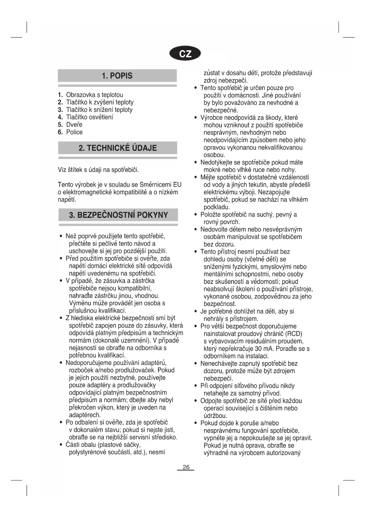 - Tento přístroj nesmí používat bez dohledu osoby (včetně dětí) se sníženými fyzickými, smyslovými nebo mentálními schopnostmi, nebo osoby bez skušeností a vědomostí; pokud neabsolvují školení o používání přístroje, vykonané osobou, zodpovědnou za jeho bezpečnost.