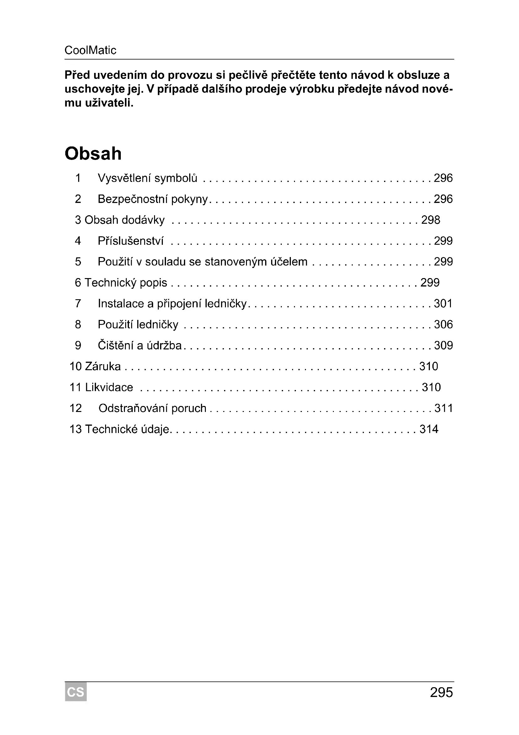 - 13 Technické údaje CS Vysvětlení symbolů CoolMatic p. 314