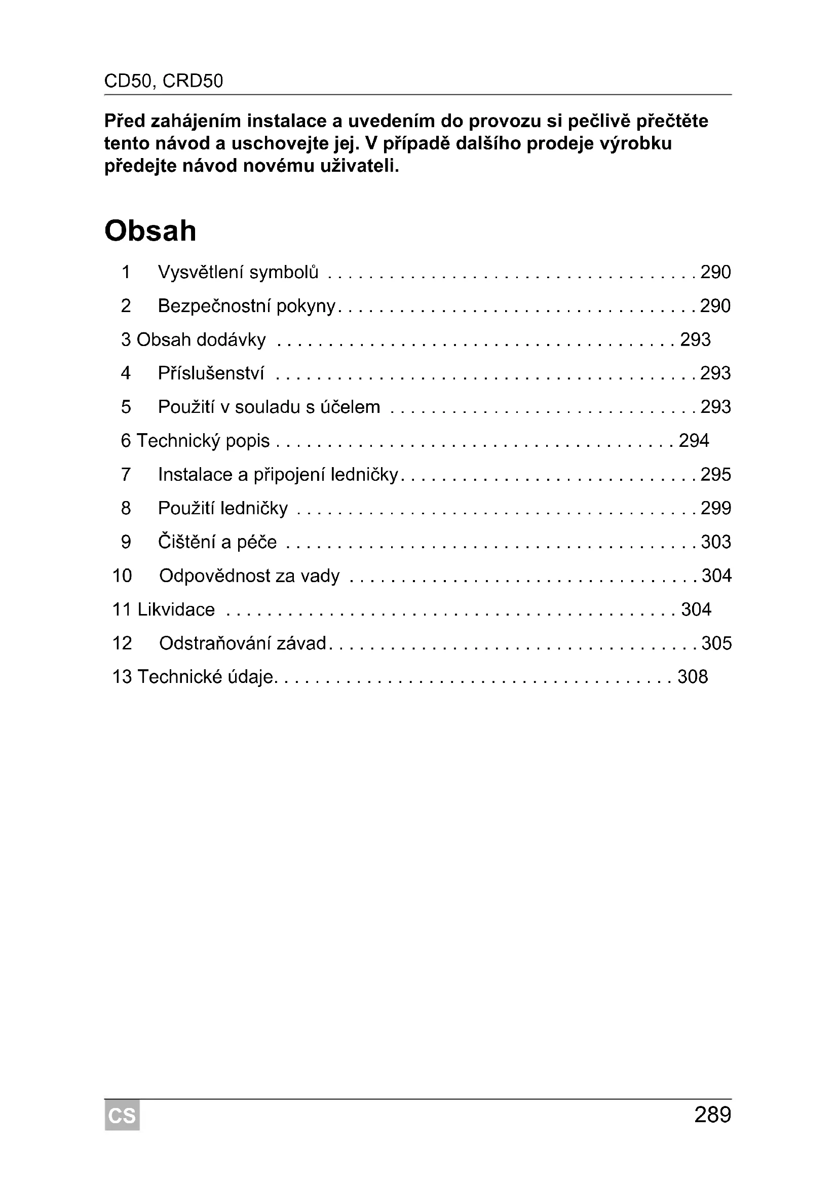 - 13 Technické údaje CS Vysvětlení symbolů CD50, CRD50 p. 308