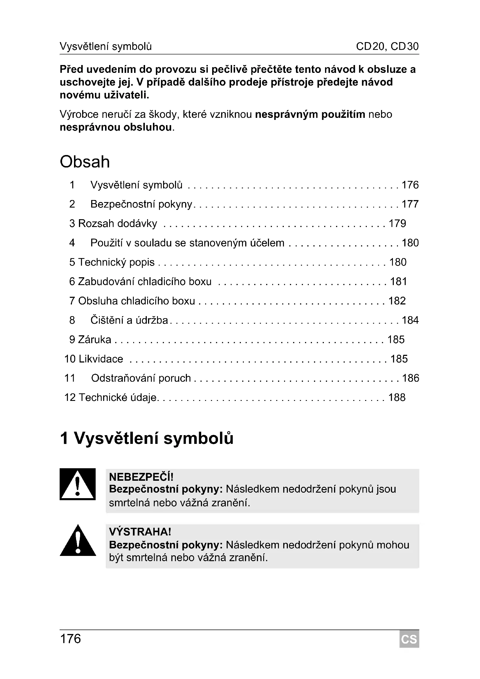 NEBEZPEČÍ! Bezpečnostní pokyny: Následkem nedodržení pokynů jsou smrtelná nebo vážná zranění. VÝSTRAHA! Bezpečnostní pokyny: Následkem nedodržení pokynů mohou být smrtelná nebo vážná zranění.CS CD20, CD30 Bezpečnostní pokyny