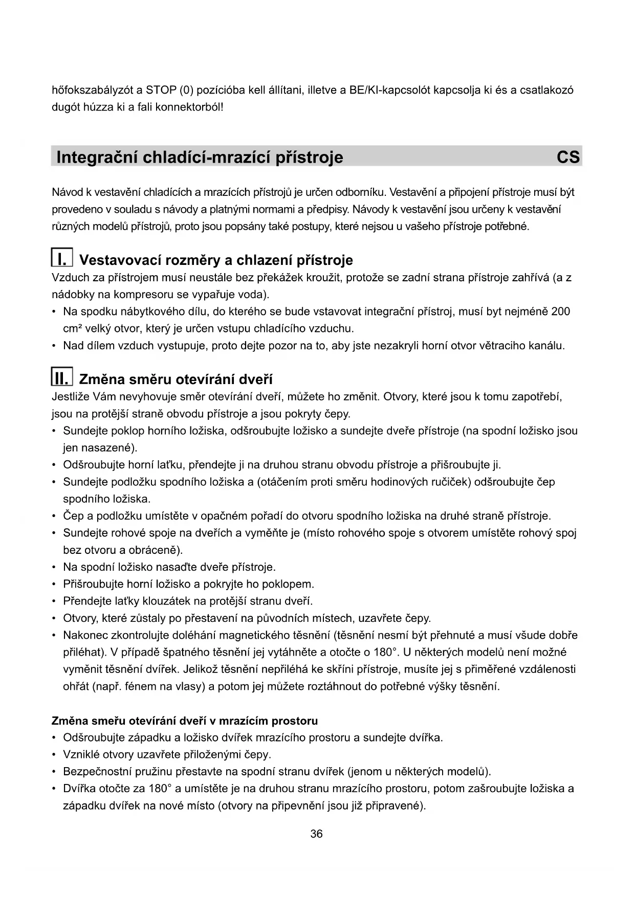 III.36 hőfokszabályzót a STOP (0) pozícióba kell állítani, illetve a BE/KI-kapcsolót kapcsolja ki és a csatlakozó dugót húzza ki a fali konnektorból! Návod k vestavění chladících a mrazících přístrojů je určen odborníku. Vestavění a připojení přístroje musí být provedeno v souladu s návody a platnými normami a předpisy. Návody k vestavění jsou určeny k vestavění různých modelů přístrojů, proto jsou popsány také postupy, které nejsou u vašeho přístroje potřebné. Vestavovací rozměry a chlazení přístroje Vzduch za přístrojem musí neustále bez překážek kroužit, protože se zadní strana přístroje zahřívá (a z nádobky na kompresoru se vypařuje voda). Na spodku nábytkového dílu, do kterého se bude vstavovat integrační přístroj, musí byt nejméně 200 cm² velký otvor, který je určen vstupu chladícího vzduchu. Nad dílem vzduch vystupuje, proto dejte pozor na to, aby jste nezakryli horní otvor větraciho kanálu. Změna směru otevírání dveří Jestliže Vám nevyhovuje směr otevírání dveří, můžete ho změnit. Otvory, které jsou k tomu zapotřebí, jsou na protější straně obvodu přístroje a jsou pokryty čepy. Sundejte poklop horního ložiska, odšroubujte ložisko a sundejte dveře přístroje (na spodní ložisko jsou jen nasazené). Odšroubujte horní laťku, přendejte ji na druhou stranu obvodu přístroje a přišroubujte ji. Sundejte podložku spodního ložiska a (otáčením proti směru hodinových ručiček) odšroubujte čep spodního ložiska. Čep a podložku umístěte v opačném pořadí do otvoru spodního ložiska na druhé straně přístroje. Sundejte rohové spoje na dveřích a vyměňte je (místo rohového spoje s otvorem umístěte rohový spoj bez otvoru a obráceně). Na spodní ložisko nasaďte dveře přístroje. Přišroubujte horní ložisko a pokryjte ho poklopem. Přendejte laťky klouzátek na protější stranu dveří. Otvory, které zůstaly po přestavení na původních místech, uzavřete čepy. Nakonec zkontrolujte doléhání magnetického těsnění (těsnění nesmí být přehnuté a musí všude dobře přiléhat). V případě špatného těsnění jej vytáhněte a otočte o 180°. U některých modelů není možné vyměnit těsnění dvířek. Jelikož těsnění nepřiléhá ke skříni přístroje, musíte jej s přiměřené vzdálenosti ohřát (např. fénem na vlasy) a potom jej můžete roztáhnout do potřebné výšky těsnění. Změna smeřu otevírání dveří v mrazícím prostoru Odšroubujte západku a ložisko dvířek mrazícího prostoru a sundejte dvířka. Vzniklé otvory uzavřete přiloženými čepy. Bezpečnostní pružinu přestavte na spodní stranu dvířek (jenom u některých modelů). Dvířka otočte za 180° a umístěte je na druhou stranu mrazícího prostoru, potom zašroubujte ložiska a západku dvířek na nové místo (otvory na připevnění jsou již připravené).