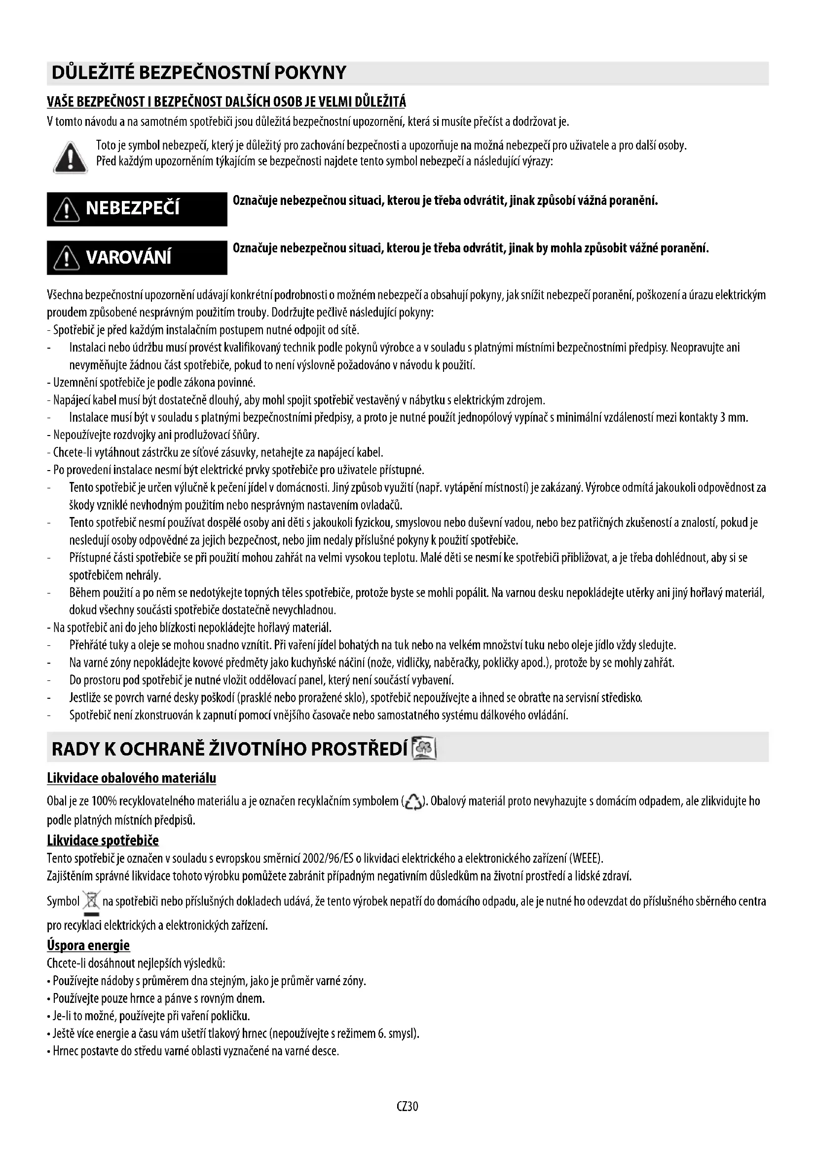 Toto je symbol nebezpečí, který je důležitý pro zachování bezpečnosti a upozorňuje na možná nebezpečí pro uživatele a pro další osoby. Před každým upozorněním týkajícím se bezpečnosti najdete tento symbol nebezpečí a následující výrazy: NEBEZPEČÍ Označuje nebezpečnou situaci, kterou je třeba odvrátit, jinak způsobí vážná poranění. VAROVÁNÍ Označuje nebezpečnou situaci, kterou je třeba odvrátit, jinak by mohla způsobit vážné poranění. RADY K OCHRANĚ ŽIVOTNÍHO PROSTŘEDÍ ČESKY Instalace strana 2 Návod k použití StranaCZ31 - Tento spotřebič je určen ke kontaktu s potravinami, je v souladu se směrnicí ( ) č. 1935/2004 a byl zkonstruován, vyroben a dodán na trh v souladu s bezpečnostními požadavky směrnice “Nízké napětí” 2006/95/ES (která nahrazuje 73/23/EHS a její další znění) a s požadavky na ochranu směrnice “EMC” 2004/ 108/ES. Ke kontrole vhodnosti nádoby pro indukční varnou desku použijte magnet: jestliže nádoby nereagují na magnet, nejsou pro tuto desku vhodné. - Přesvědčte se, zda dno hrnce není drsné, protože by mohlo poškrábat povrch varné desky. Zkontrolujte nádobí. - Nikdy nestavte horké hrnce a pánve na povrch ovládacího panelu varné desky. Mohl by se poškodit. Po vybalení spotřebiče se přesvědčte, zda se při dopravě nepoškodil a v případě pochybností se obraťte na prodejce nebo na servis.