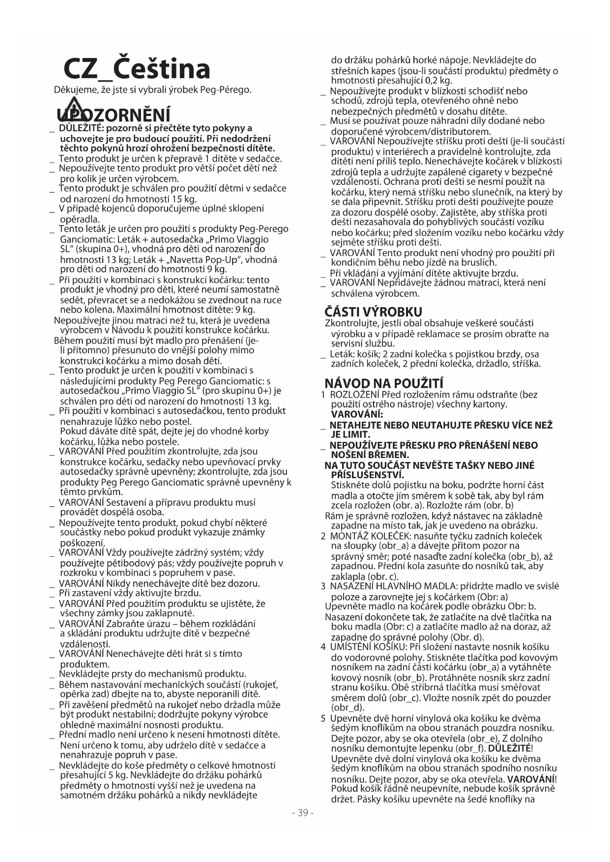 TUOTTEEN HUOLTO: Suojaa tuote sateelta, lumelta ja vedeltä. Jatkuva altistuminen auringonvalolle saattaa muuttaa monien materiaalien väriä. Säilytä tuote kuivassa paikassa. Tarkasta ja huolla tärkeimmät osatsäännöllisin välein. RUNGON PUHDISTUS: Puhdista muoviosat säännöllisesti kostealla kankaalla. Älä käytä liuotteita tai muita vastaavia tuotteita. Pidä tuotteen metalliosat kuivina, jotta ne eivät ruostu. Pidä kaikki liikkuvat osat (säätömekanismit, kiinnitysmekanismit, pyörät jne.) puhtaina ja poista niistä sora ja hiekka. Voitele tarvittaessa kevytöljyllä. SADESUOJAN PUHDISTUS: Pese saippuavedellä ja sienellä. Älä käytä pesuaineita. KANGASOSIEN PUHDISTUS: pöly harjataan kangasosista ja kangas pestään käsin enintään 30-asteisessa vedessä. Ei saa vääntää kuivaksi. Ei kloorivalkaisua, ei silitystä, ei kuivapesua, ei tahranpoistoa liuotteilla, ei rumpukuivausta. PEG-PÉREGO S.p.A. Peg Pérego S.p.A. on ISO 9001 -sertifioitu yhtiö. Sertifiointi on asiakkaille ja kuluttajille tae siitä, että yritys toimii läpinäkyvästi ja luotettavasti. Peg Pérego voi koska tahansa tehdä tässä julkaisussa kuvattuihin malleihin teknisistä tai kaupallisista syistä muutoksia. Peg Pérego haluaa palvella asiakkaitaan ja vastata parhaansa mukaan kaikkiin heidän tarpeisiinsa. Siksi asiakkaidemme mielipiteet ovat meille erittäin tärkeitä ja arvokkaita. Olisimmekin hyvin kiitollisia, jos haluaisit tuotettamme käytettyäsi täyttää KULUTTAJAN TYYTYVÄISYYSKYSELYN ja kertoa siinä mahdollisista huomautuksistasi ja parannusehdotuksistasi. Kyselyn löydät Internet-sivuiltamme: www.pegperego.com PEG-PÉREGO-ASIAKASPALVELU Jos osia tuotteesta katoaa tai vaurioituu, vaihda niiden tilalle ainoastaan alkuperäisiä Peg Pérego -varaosia. Ota yhteys Peg Perego -asiakaspalveluun korjauksiin, vaihtoihin, tuotetietoihin ja alkuperäisten varaosien ja lisäosien tilaamiseen liittyvissä asioissa ja ilmoita mahdollinen tuotteen sarjanumero. puh. +39 039 60 88 213 fax +39 039 33 09 992 s-posti assistenza@pegperego.it Internet-sivu www.pegperego.com- 39 - CZ_Čeština Děkujeme, že jste si vybrali ýrobek Peg-Pérego. UPOZORNĚNÍ _ DŮLEŽITÉ: pozorně si přečtěte tyto pokyny a uchovejte je pro budoucí použití. Při nedodržení těchto pokynů hrozí ohrožení bezpečnosti dítěte. _ Tento produkt je určen k přepravě 1 dítěte v sedačce. _ Nepoužívejte tento produkt pro větší počet dětí než pro kolik je určen výrobcem. _ Tento produkt je schválen pro použití dětmi v sedačce od narození do hmotnosti 15 kg. _ V případě kojenců doporučujeme úplné sklopení opěradla. _ Tento leták je určen pro použití s produkty Peg-Perego Ganciomatic: Leták + autosedačka „Primo Viaggio SL“ (skupina 0+), vhodná pro děti od narození do hmotnosti 13 kg; Leták + „Navetta Pop-Up“, vhodná pro děti od narození do hmotnosti 9 kg. _ Při použití v kombinaci s konstrukcí kočárku: tento produkt je vhodný pro děti, které neumí samostatně sedět, převracet se a nedokážou se zvednout na ruce nebo kolena. Maximální hmotnost dítěte: 9 kg. Nepoužívejte jinou matraci než tu, která je uvedena výrobcem v Návodu k použití konstrukce kočárku. Během použití musí být madlo pro přenášení (je- li přítomno) přesunuto do vnější polohy mimo konstrukci kočárku a mimo dosah dětí. _ Tento produkt je určen k použití v kombinaci s následujícími produkty Peg Perego Ganciomatic: s autosedačkou „Primo Viaggio SL“ (pro skupinu 0+) je schválen pro děti od narození do hmotnosti 13 kg. _ Při použití v kombinaci s autosedačkou, tento produkt nenahrazuje lůžko nebo postel. Pokud dáváte dítě spát, dejte jej do vhodné korby kočárku, lůžka nebo postele. _ VAROVÁNÍ Před použitím zkontrolujte, zda jsou konstrukce kočárku, sedačky nebo upevňovací prvky autosedačky správně upevněny; zkontrolujte, zda jsou produkty Peg Perego Ganciomatic správně upevněny k těmto prvkům. _ VAROVÁNÍ Sestavení a přípravu produktu musí provádět dospělá osoba. _ Nepoužívejte tento produkt, pokud chybí některé součástky nebo pokud produkt vykazuje známky poškození. _ VAROVÁNÍ Vždy používejte zádržný systém; vždy používejte pětibodový pás; vždy používejte popruh v rozkroku v kombinaci s popruhem v pase. _ VAROVÁNÍ Nikdy nenechávejte dítě bez dozoru. _ Při zastavení vždy aktivujte brzdu. _ VAROVÁNÍ Před použitím produktu se ujistěte, že všechny zámky jsou zaklapnuté. _ VAROVÁNÍ Zabraňte úrazu – během rozkládání a skládání produktu udržujte dítě v bezpečné vzdálenosti. _ VAROVÁNÍ Nenechávejte děti hrát si s tímto produktem. _ Nevkládejte prsty do mechanismů produktu. _ Během nastavování mechanických součástí (rukojeť, opěrka zad) dbejte na to, abyste neporanili dítě. _ Při zavěšení předmětů na rukojeť nebo držadla může být produkt nestabilní; dodržujte pokyny výrobce ohledně maximální nosnosti produktu. _ Přední madlo není určeno k nesení hmotnosti dítěte. Není určeno k tomu, aby udrželo dítě v sedačce a nenahrazuje popruh v pase. _ Nevkládejte do koše předměty o celkové hmotnosti přesahující 5 kg. Nevkládejte do držáku pohárků předměty o hmotnosti vyšší než je uvedena na samotném držáku pohárků a nikdy nevkládejte do držáku pohárků horké nápoje. Nevkládejte do střešních kapes (jsou-li součástí produktu) předměty o hmotnosti přesahující 0,2 kg. _ Nepoužívejte produkt v blízkosti schodišť nebo schodů, zdrojů tepla, otevřeného ohně nebo nebezpečných předmětů v dosahu dítěte. _ Musí se používat pouze náhradní díly dodané nebo doporučené výrobcem/distributorem. _ VAROVÁNÍ Nepoužívejte stříšku proti dešti (je-li součástí produktu) v interiérech a pravidelně kontrolujte, zda dítěti není příliš teplo. 