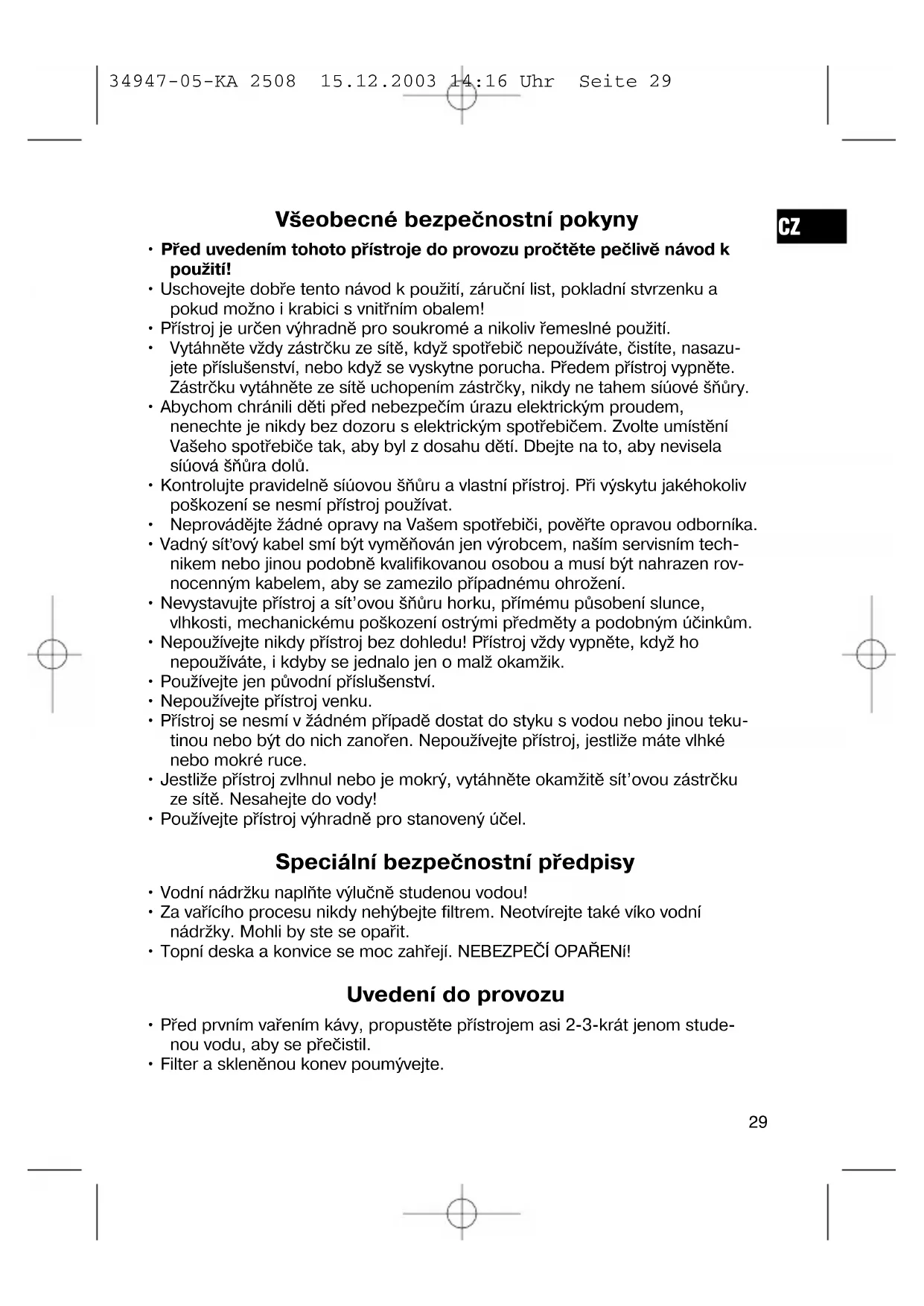 34947-05-KA 2508 15.12.2003 14:16 Uhr Seite 30Záruka Na námí prodávaný přistroj poskytujeme záruku 12 mésíců ode dne prodeje (pokladní doklad). Po dobu trvání záruční doby odstraníme bezplatné závady přístroje, které vzni- knou v důsledku výrobních či materiálových vad, a to bud'to formou opravy nebo výměnou. Jako záruční list platí doklad o koupi. Bez tohoto dokladu nemůže být výměna nebo oprava bezplatně provedena. V případě spadajícím do záruky odevzdejte plný přístroj v originálním obalu a s pokladním dokladem Vašemu odchodníkovi. Poškození skla nebo závady na příslušenství nejsou důvodem k výměně přístro- je, ale tyto díly budou bezplatně vyměněny. V tomto případé nezasílejte celý přístroje, ale objednejte si pouze poškozenou součást příslušenství! Čištění, údržba nebo výměna opotřebovaných částí nespadají do rozsahu zéruky a budou proto provedeny jen oproti úhradě. Zéruka zaniká v případě neoprávněněho zásahu do přístroje. Po uplynutí záruky Po uplynutí záuční doby mohou být opravy prováděny příslušným obchodem nebo servisem jen za úhradu.