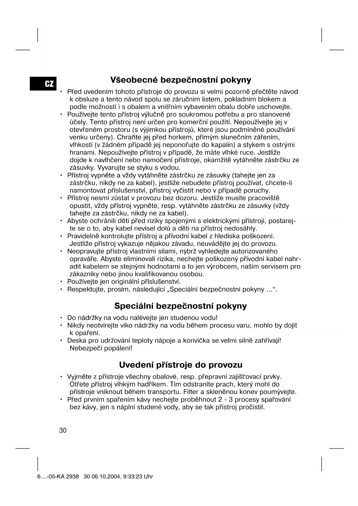 - Před prvním spařením kávy nechejte proběhnout 2 - 3 procesy spařování bez kávy, jen s náplní studené vody, aby se tak přístroj pročistil. 6....-05-KA 2938 30 06.10.2004, 9:33:23 UhrCZ