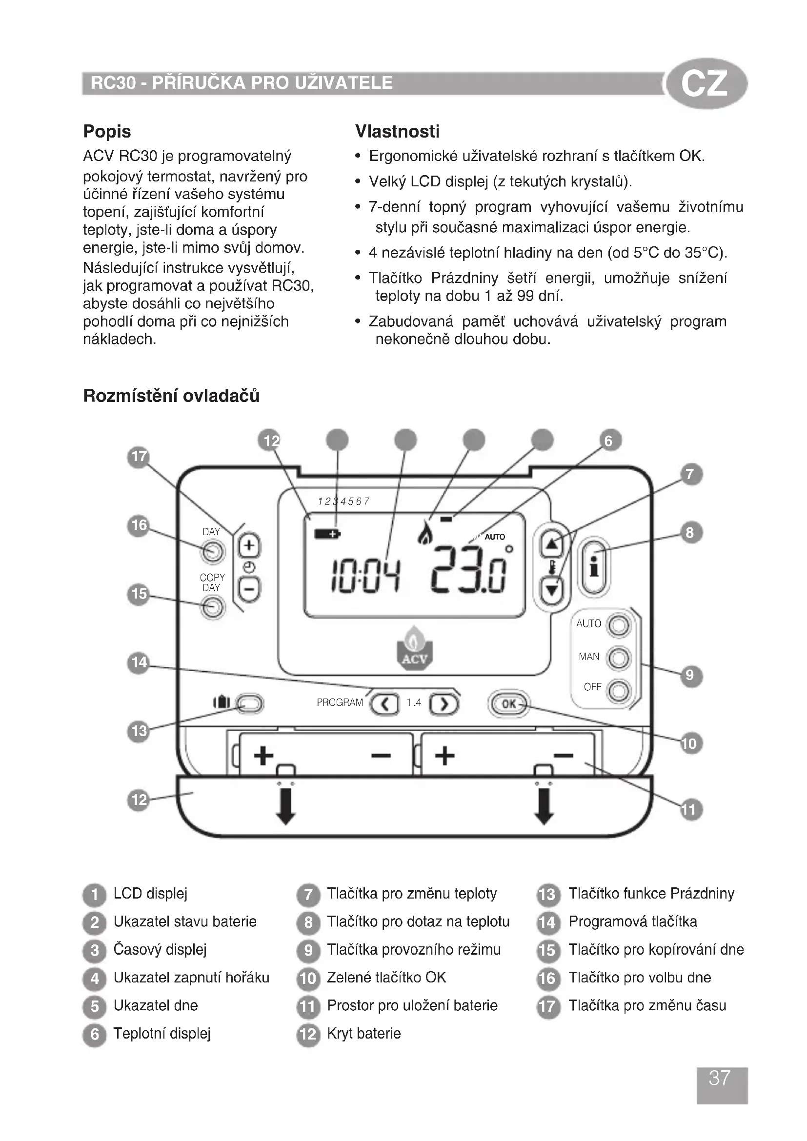 ACV RC30 je programovatelny pokojoyy termostat, navrzeny pro učinneřizenívašeho systému topení, zajištujíci komfortné teploty, jste-li doma a USpory energie, jste-li mimo svúj domov. Nasledujíci instrukce vysvětluji, jak programovat a používat RC30, abyste dosáhlco nevjětsího pohodlí doma pri co nejnižsích nákladech.