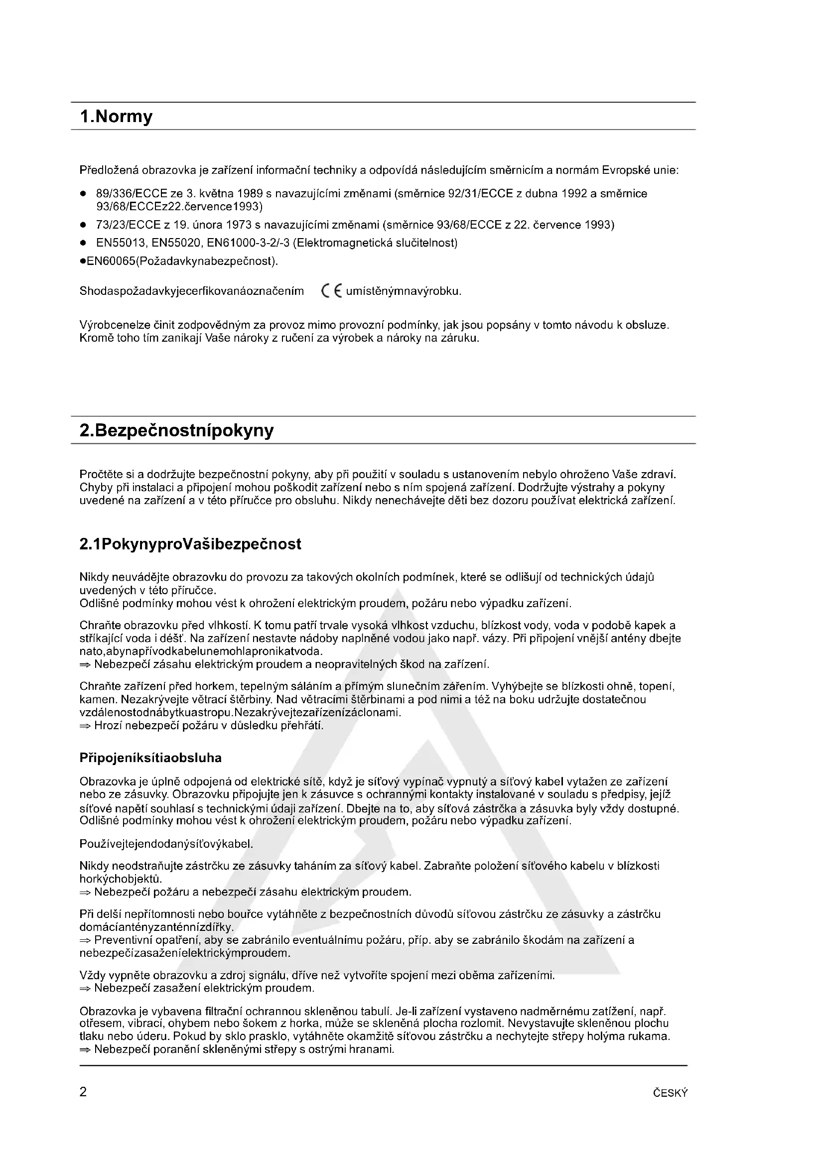 Předložená obrazovka je zařízení informační techniky a odpovídá následujícím směrnicím a normám Evropské unie: D 89/336/ECCE ze 3. května 1989 s navazujícími změnami (směrnice 92/31/ECCE z dubna 1992 a směrnice 93/68/ECCE z 22. července 1993) D 73/23/ECCE z 19. února 1973 s navazujícími změnami (směrnice 93/68/ECCE z 22. července 1993) D EN55013, EN55020, EN61000-3-2/-3 (Elektromagnetická slučitelnost) D EN60065 (Požadavky na bezpečnost). Shoda s požadavky je cerfikovaná označením umístěným na výrobku. Výrobcenelze činit zodpovědným za provoz mimo provozní podmínky, jak jsou popsány v tomto návodu k obsluze. Kromě toho tím zanikají Vaše nároky z ručení za výrobek a nároky na záruku.