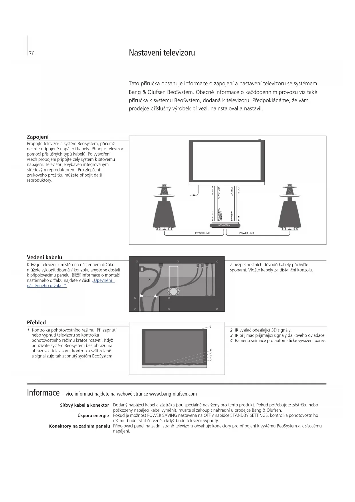 4Informace – více informací najdete na webové stránce www.bang-olufsen.com Síťový kabel a konektor Úspora energie Konektory na zadním panelu Dodaný napájecí kabel a zástrčka jsou speciálně navrženy pro tento produkt. Pokud potřebujete zástrčku nebo poškozený napájecí kabel vyměnit, musíte si zakoupit náhradní u prodejce Bang& Olufsen. Pokud je možnost POWER SAVING nastavena na OFF v nabídce STANDBY SETTINGS, kontrolka pohotovostního režimu bude svítit červeně, i když bude televizor vypnutý. Připojovací panel na zadní straně televizoru obsahuje konektory pro připojení k systému BeoSystem a k síťovému napájení. Nastavení televizoru Tato příručka obsahuje informace o zapojení a nastavení televizoru se systémem Bang & Olufsen BeoSystem. Obecné informace o každodenním provozu viz také příručka k systému BeoSystem, dodaná k televizoru. Předpokládáme, že vám prodejce příslušný výrobek přivezl, nainstaloval a nastavil. Vedení kabelů Když je televizor umístěn na nástěnném držáku, můžete vyklopit distanční konzolu, abyste se dostali k připojovacímu panelu. Bližší informace o montáži nástěnného držáku najdete v části „Upevnění nástěnného držáku.“ Zapojení Propojte televizor a systém BeoSystem, přičemž nechte odpojené napájecí kabely. Připojte televizor pomocí příslušných typů kabelů. Po vytvoření všech propojení připojte celý systém k síťovému napájení. Televizor je vybaven integrovaným středovým reproduktorem. Pro zlepšení zvukového prožitku můžete připojit další reproduktory. Přehled 1 Kontrolka pohotovostního režimu. Při zapnutí nebo vypnutí televizoru se kontrolka pohotovostního režimu krátce rozsvítí. Když používáte systém BeoSystem bez obrazu na obrazovce televizoru, kontrolka svítí zeleně a signalizuje tak zapnutý systém BeoSystem. 2 IR vysílač odesílající 3D signály. 3 IR přijímač přijímající signály dálkového ovladače. 4 Rameno snímače pro automatické vyvážení barev. Z bezpečnostních důvodů kabely přichyťte sponami. Vložte kabely za distanční konzolu.