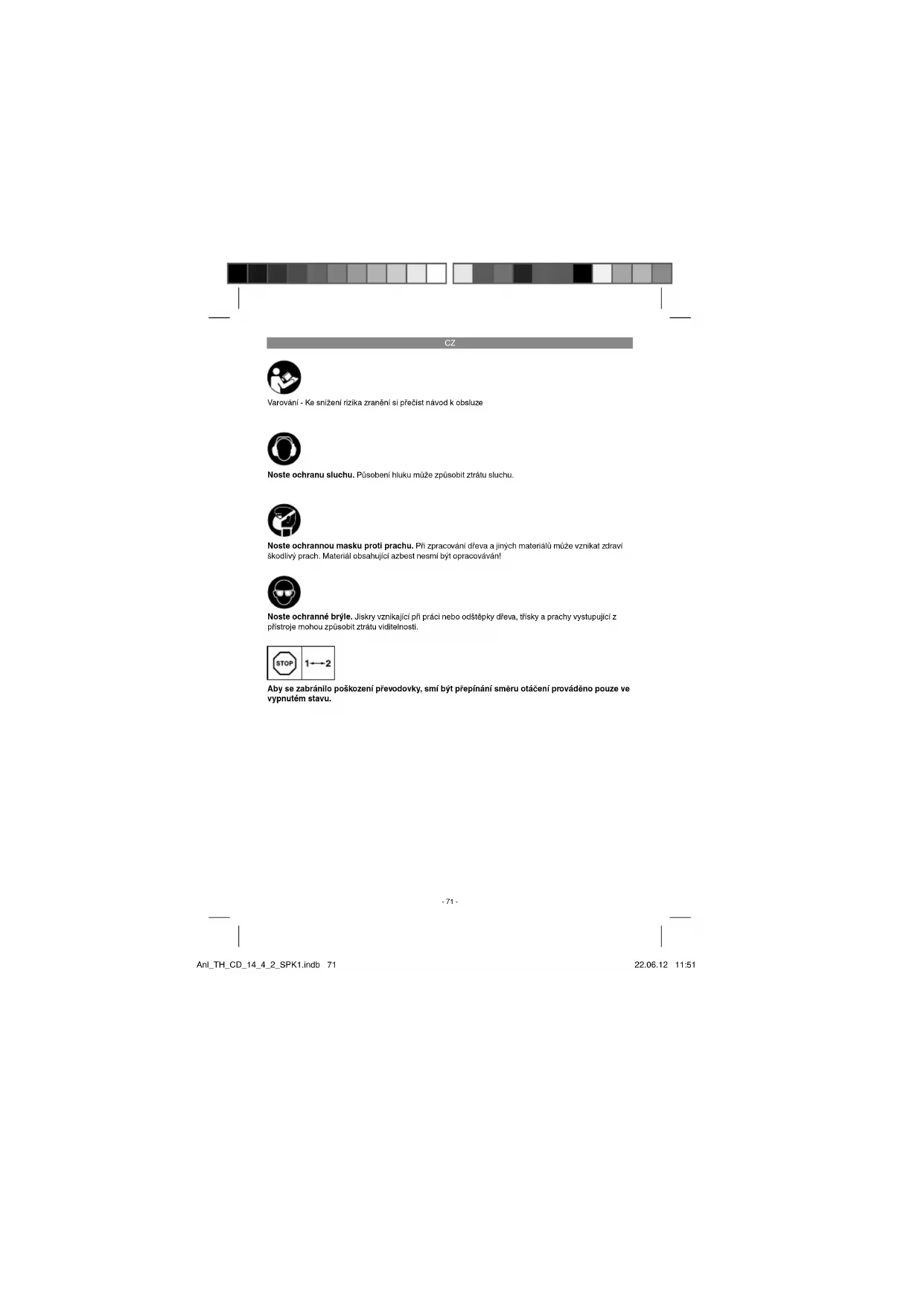 Varování - Ke snížení rizika zranění si přečíst návod k obsluze Noste ochranu sluchu. Působení hluku může způsobit ztrátu sluchu. Noste ochranné brýle. Jiskry vznikající při práci nebo odštěpky dřeva, třísky a prachy vystupující z přístroje mohou způsobit ztrátu viditelnosti. Noste ochrannou masku proti prachu. Při zpracování dřeva a jiných materiálů může vznikat zdraví škodlivý prach. Materiál obsahující azbest nesmí být opracováván! Aby se zabránilo poškození převodovky, smí být přepínání směru otáčení prováděno pouze ve vypnutém stavu. Anl_TH_CD_14_4_2_SPK1.indb 71Anl_TH_CD_14_4_2_SPK1.indb 71 22.06.12 11:5122.06.12 11:51CZ