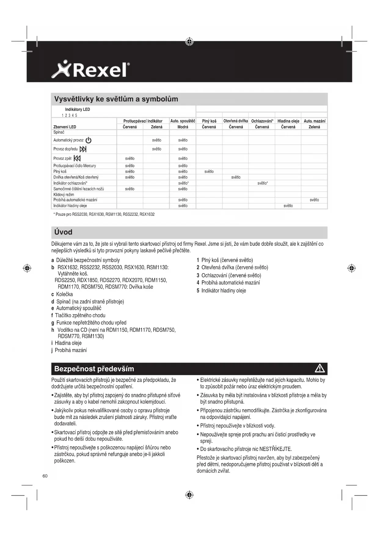 ProtiucpávacíčidloMercury Skartovací přístroj Mercury rozřeže pouze tolik listů, na kolik je dimenzován. Např. přístroj se skartovací kapacitou 22 listů se při podání většího počtu listů nespustí. Čidla ve vstupní štěrbině měří tloušťku papíru podávaného ke skartování. Schopnost či neschopnost rozřezání je zobrazena rozsvícením zeleného nebo červeného světla. Zelené světlo znamená, že počet podávaných listů je v rozmezí kapacity skartovacího přístroje a přístroj je rozřeže. Červené světlo znamená, že jste do štěrbiny podali příliš mnoho listů a musíte je odebrat, jinak se přístroj nespustí. Vzhledem k tomu, že nemůžete skartovat více listů, než na kolik je přístroj dimenzovaný, nedojde k ucpání papíru. Tím se vyhnete ztrátě času, nutného k odstranění ucpaného papíru zpětným chodem, i nepořádku, který tímto vznikne. Vzácnýpřípaducpání Dojde-li ve vzácném případě k ucpání skartovacího přístroje, použijte k odblokování zpětný chod (viz část o zpětném chodu). Střídavým přepínáním mezi zpětným chodem a nepřetržitým chodem vpřed se vstupní štěrbina odblokuje. Bezpečnostnífunkcepřiotevřených dvířkách Otevřou-li se během skartace dvířka, skartovací přístroj se z bezpečnostních důvodů okamžitě zastaví, a symbol otevřených dvířek na indikačním panelu bude červeně svítit. Přehřátí Pokud malé kancelářské modely (RSS2030, RSX1630, RSM1130, RSS2232 a RSX1632) používáte dlouho nepřetržitě, mohou se přehřát. Jestliže se to stane, symbol teploměru na indikačním panelu se rozsvítí. Když bude skartovací přístroj opět připraven k použití, symbol teploměru svítit nebude. Ovládacípanelskartovacího přístroje ZpětDopředu Automatický chod Bezpečnost především Znamená, že byste měli být opatrní, jelikož dlouhé vlasy se mohou zaplést do řezacího mechanismu. Znamená, abyste nesahali do podávací štěrbiny řezacího mechanismu. Znamená, abyste dávali pozor na vázanky a jiné volné součásti oděvu, které by se mohly zaplést do řezného mechanismu. Znamená, abyste umístili skartovací přístroj mimo dosah dětí. Znamená, abyste dávali pozor na volné šperky, které by se mohly zaplést do řezacího mechanismu. Znamená, že jsou dvířka otevřená. Znamená, že je koš plný. Znamená, abyste na přístroj nestříkali spreji. Znamená, že se přístroj ochlazuje. PouzeproRSM1130,RDM1150aRDSM750. Znamená, abyste neprováděli skartaci CD. Znamená, abyste neprováděli skartaci kreditních karet. Znamená, abyste neprováděli skartaci kancelářských sponek. Znamená, abyste neprováděli skartaci kancelářských svorek. Počátečnínastavení Skartovací přístroj je navržen k automatickému mazání řezacího mechanismu. dle potřeby, aby výrobek nepřetržitě podával maximální výkon a byla prodloužena jeho životnost. Před prvním zapnutím přístroje otevřete víčko olejové nádržky na vrcholu skartovacího přístroje (j) a do nádržky nalijte standardně dodávanou 60ml lahvičku oleje pro skartovací přístroje. Je to dostatečné množství, aby se mohl skartovací přístroj poprvé spustit a pracoval nepřetržitě přibližně jednu hodinu, než bude nádržku potřeba opět naplnit. Stiskněte a držte automatický spouštěč (f) na 5 sekund, aby se spustilo čerpadlo a naplnil systém. Tuto operaci je potřeba provést pouze při prvním použití skartovacího přístroje. Když se rozsvítí indikátor ‘Olejová náplň’ , otevřete víčko olejové nádržky (j) a znovu naplňte olejovou nádržku z láhve se standardním olejem pro skartovací přístroje Rexel (1760049). Automatické mazání trvá přibližně 2 sekund a během této doby uslyšíte distribuční čerpadlo. Automatické mazání probíhá po 15 minutách skartace. Znamená hladinu oleje. Znamená, že probíhá mazání.62 Zpětnýchod