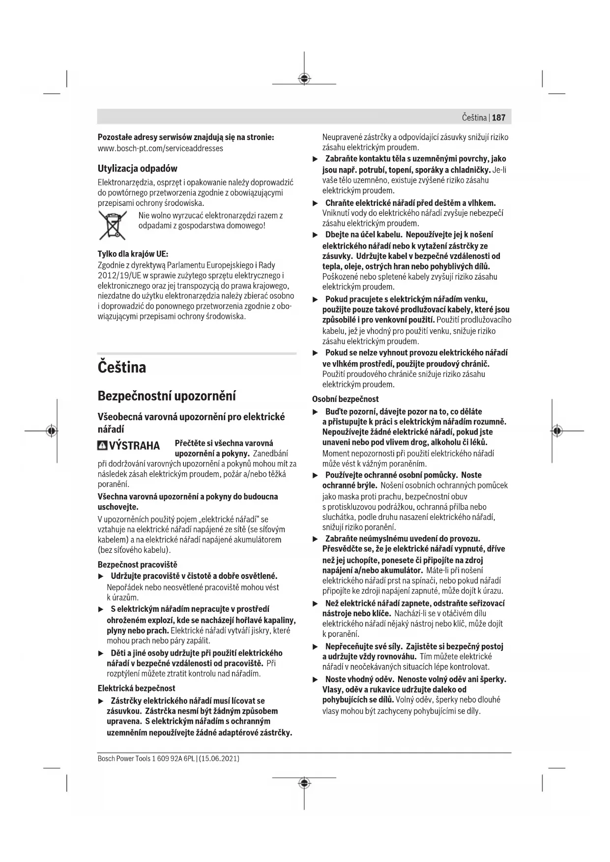 Podane wartości stopni prędkości obrotowej są wartościami orientacyjnymi. u Dopuszczalna prędkość obrotowa stosowanego narzę- dzia roboczego musi być co najmniej równa podanej na elektronarzędziu prędkości maksymalnej. Narzę- dzia robocze, obracające się z szybszą niż dopuszczalna prędkością, mogą pęknąć, a ich fragmenty odprysnąć. Wskazówki dotyczące pracy u Przed przystąpieniem do jakichkolwiek prac przy elektronarzędziu należy wyjąć wtyczkę z gniazda. u Należy zachować ostrożność podczas wykonywania szczelin w ścianach nośnych, zob. rozdział „Wskazów- ki dotyczące statyki“. u Jeżeli ciężar własny obrabianego przedmiotu nie gwa- rantuje stabilnej pozycji, należy go zamocować. u Elektronarzędzia nie należy przeciążać do tego stop- nia, że zatrzyma się ono samoczynnie. u Po silnym obciążeniu elektronarzędzia, należy pozwo- lić mu pracować przez parę minut na biegu jałowym, w celu ochłodzenia narzędzia roboczego. u Elektronarzędzia nie wolno eksploatować przy użyciu stolika tnącego. u Nie należy dotykać tarcz szlifierskich i tnących, zanim nie ostygną. Tarcze szlifierskie rozgrzewają się podczas obróbki do bardzo wysokich temperatur. Listkowa tarcza szlifierska Za pomocą listkowej tarczy szlifierskiej (osprzęt) możliwa jest obróbka powierzchni obłych i profili. W porównaniu do tradycyjnych tarcz szlifierskich, listkowe tarcze szlifierskie charakteryzują się znacznie dłuższą żywotnością, wyraźnie zmniejszonym poziomem emisji hałasu i niższymi temperatu- rami szlifowania. Szlifowanie powierzchni u W żadnym wypadku nie wolno używać tarcz tnących do szlifowania powierzchni. Najlepsze efekty przy szlifowaniu powierzchni osiąga się pro- wadząc tarczę szlifierską pod kątem 30° do 40° w stosunku do obrabianej powierzchni. Elektronarzędzie należy prowa- dzić z umiarkowanym dociskiem, przesuwając je raz w jedną, raz w drugą stronę. Zapobiega to przegrzewaniu się obrabia- nego przedmiotu oraz jego przebarwieniom lub uszkodze- niom (wgłębienia, rowki). Bosch Power Tools 1 609 92A 6PL | (15.06.2021)186 | Polski Cięcie metalu u W przypadku cięcia za pomocą spajanych materiałów ściernych należy użyć specjalnej pokrywy ochronnej do cięcia (6). Podczas cięcia należy zwrócić uwagę na równomierny posuw elektronarzędzia, dostosowany do właściwości obrabianego materiału. Nie należy wywierać nacisku na tarczę tnącą, przechylać jej ani wykonywać nią ruchów oscylacyjnych. Nie wolno wyhamowywać biegu tarczy poprzez wywieranie bocznego nacisku. Elektronarzędzie należy za- wsze prowadzić przeciw- bieżnie do kierunku obro- tów tarczy. W przeciwnym razie istnieje niebezpie- czeństwo, że zostanie ono w sposób niekontrolowany wypchnięte ze szczeliny. W przypadku cięcia profili i rur czworokątnych, zaleca się zacząć pracę od najmniej- szego przekroju. Cięcie kamienia u Podczas cięcia kamienia należy zadbać o odpowiednie odsysanie pyłu. u Należy stosować maskę przeciwpyłową. u Elektronarzędzie wolno stosować wyłącznie do cięcia i szlifowania na sucho. Do cięcia kamienia najlepiej jest użyć diamentowej tarczy tnącej. Podczas pracy z pokrywą odsysającą do cięcia z prowadnicą saneczkową (18) należy stosować odpowiedni odkurzacz, dopuszczony do usuwania pyłu kamiennego. Bosch ma w swojej ofercie odpowiednie odkurzacze. Włączyć elektronarzędzie i oprzeć je przednią częścią prowadnicy saneczkowej o obrabiany przedmiot. Pra- cować z równomiernym po- suwem, dostosowanym do właściwości obrabianego materiału. Przy cięciu szczególnie twardych materiałów, np. betonu o dużej zawartości żwiru, może dojść do przegrzania, a tym samym uszkodzenia tarczy diamentowej. Snop iskier wokół tarczy diamentowej jest objawem jej przegrzania. Należy wtedy natychmiast przerwać cięcie i ochłodzić tar- czę, na krótko włączając elektronarzędzie z najwyższą pręd- kością obrotową, bez obciążenia. Wyraźnie niższa wydajność cięcia i snop iskier wokół tarczy to oznaki stępienia diamentowej tarczy tnącej. Można ją na- ostrzyć, wykonując kilka krótkich cięć w materiałach abrazyj- nych (np. piaskowcu). Wskazówki dotyczące statyki Wykonywanie szczelin w ścianach nośnych podlega przepi- som normy DIN1053, Część 1 lub przepisom obowiązują- cym w danym kraju. Przepisów tych należy bezwzględnie przestrzegać.Przed przystąpieniem do pracy należy skonsul- tować się z inżynierem odpowiedzialnym za kwestie statycz- ne, architektem lub kierownikiem budowy. Konserwacja i serwis Konserwacja i czyszczenie u Przed przystąpieniem do jakichkolwiek prac przy elektronarzędziu należy wyjąć wtyczkę z gniazda. u Utrzymywanie urządzenia i szczelin wentylacyjnych w czystości gwarantuje prawidłową i bezpieczną pracę. u W ekstremalnych warunkach pracy należy w miarę możliwości zawsze korzystać z systemu odsysania py- łu. Należy też często przedmuchiwać otwory wentyla- cyjne i stosować wyłącznik ochronny różnicowoprądo- wy. Podczas obróbki metali może dojść do osadzenia się wewnątrz elektronarzędzia pyłu metalicznego, mogącego przewodzić prąd. Może to mieć niekorzystny wpływ na izolację ochronną elektronarzędzia. Należy obchodzić się pieczołowicie z osprzętem podczas przechowywania i podczas pracy. Jeżeli konieczna okaże się wymiana przewodu przyłączenio- wego, należy zlecić ją firmie Bosch lub autoryzowanemu ser- wisowi elektronarzędzi Bosch, co pozwoli uniknąć ryzyka za- grożenia bezpieczeństwa. Obsługa klienta oraz doradztwo dotyczące użytkowania Ze wszystkimi pytaniami, dotyczącymi naprawy ikonserwa- cji nabytego produktu oraz dostępu do części zamiennych, prosimy zwracać się do punktów obsługi klienta. Rysunki techniczne oraz informacje o częściach zamiennych można znaleźć pod adresem: www.bosch-pt.com Nasz zespół doradztwa dotyc