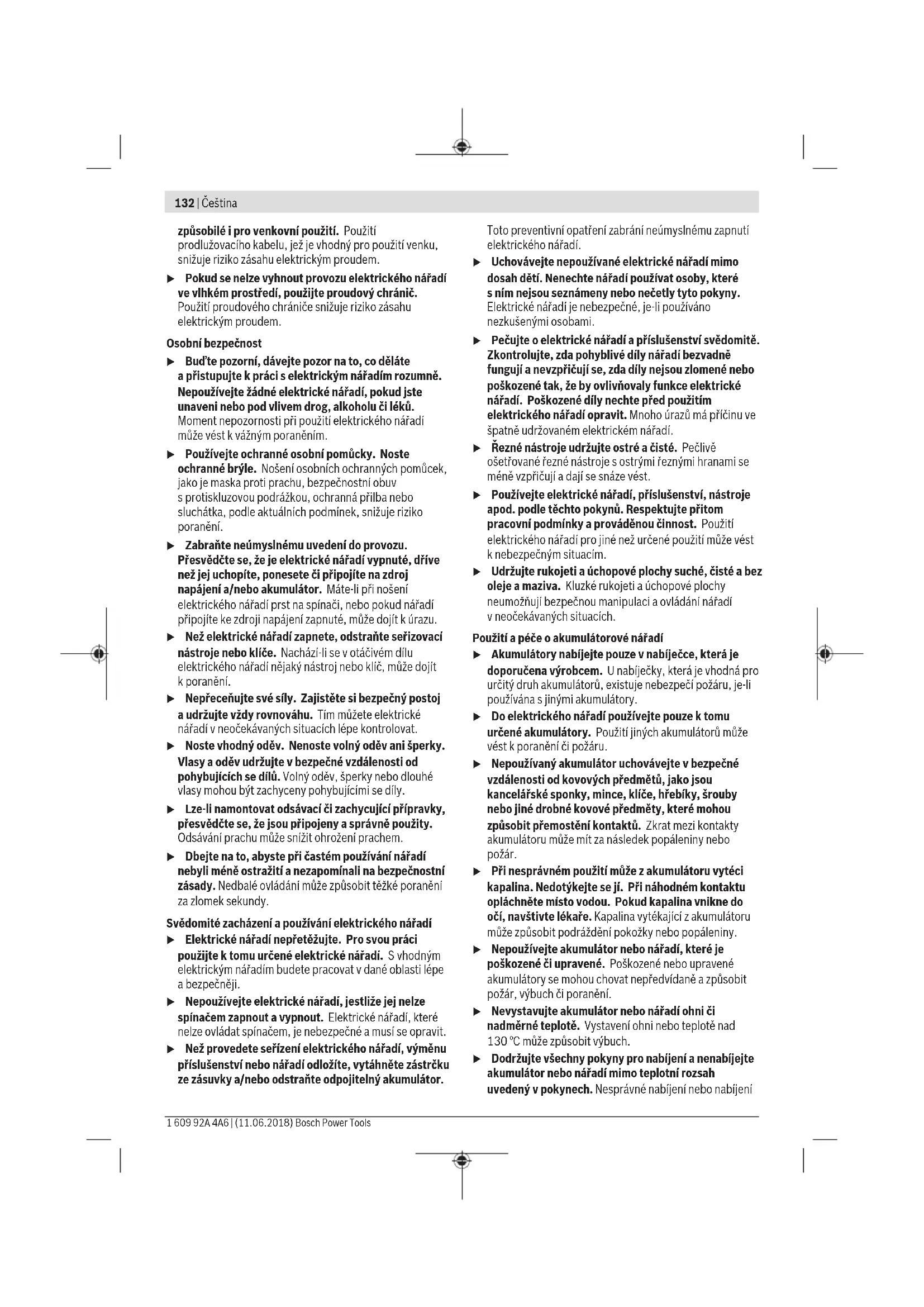 dłu- gości śruby, o średnicy równej średnicy gwinta śruby. Konserwacja i serwis Konserwacja i czyszczenie Przed wszystkimi pracami przy elektronarzędziu (np. dogląd, wymiana narzędzi itd.) jak i przed jego trans- portem i składowaniem należy wyjąć akumulator z elektronarzędzia. Przy niezamierzonym uruchomieniu włącznika/wyłącznika istnieje niebezpieczeństwo obra- żeń. Aby zapewnić bezpieczną i wydajną pracę, elektrona- rzędzie i szczeliny wentylacyjne należy utrzymywać w czystości. W razie awarii akumulatora należy zwrócić się do autoryzowa- nego serwisu elektronarzędzi Bosch. Obsługa klienta oraz doradztwo dotyczące użyt- kowania W punkcie obsługi klienta można uzyskać odpowiedzi na pyta- nia dotyczące napraw i konserwacji nabytego produktu, a tak- że dotyczące części zamiennych. Rysunki rozłożeniowe oraz informacje dotyczące części zamiennych można znaleźć rów- nież pod adresem: www.bosch-pt.com Nasz zespół doradztwa dotyczącego użytkowania odpowie na wszystkie pytania związane z produktami firmy Bosch oraz ich osprzętem. Przy wszystkich zgłoszeniach oraz zamówieniach części za- miennych konieczne jest podanie 10-cyfrowego numeru kata- logowego, znajdującego się na tabliczce znamionowej pro- duktu. Polska Robert Bosch Sp. z o.o. Serwis Elektronarzędzi Ul. Szyszkowa 35/37 02-285 Warszawa Na www.bosch-pt.pl znajdą Państwo wszystkie szczegóły do- tyczące usług serwisowych online. Tel.: 22 7154460 Faks: 22 7154441 E-Mail: bsc@pl.bosch.com Infolinia Działu Elektronarzędzi: 801 100900 (w cenie połączenia lokalnego) E-Mail: elektronarzedzia.info@pl.bosch.com www.bosch.pl Transport Załączone w dostawie akumulatory litowo jonowe podlegają wymaganiom przepisów dotyczących towarów niebezpiecz- nych. Akumulatory mogą być transportowane drogą lądową przez użytkownika bez konieczności spełnienia jakichkolwiek dalszych warunków. W przypadku przesyłki przez osoby trzecie (np. transport dro- gą powietrzną lub za pośrednictwem firmy spedycyjnej) nale- ży dostosować się do szczególnych wymogów dotyczących opakowania i znaczenia towaru. W takim wypadku podczas przygotowywania towaru do wysyłki należy skonsultować się z ekspertem d/s towarów niebezpiecznych. Akumulatory można wysyłać tylko wówczas, gdy ich obudowa nie jest uszkodzona. Odsłonięte styki należy zakleić, a akumu- lator zapakować w taki sposób, aby nie mógł on się poruszać (przesuwać) w opakowaniu. Należy wziąć też pod uwagę ewentualne przepisy prawa krajo- wego. Usuwanie odpadów Elektronarzędzia, akumulatory, osprzęt i opakowanie należy oddać do powtórnego przetworzenia zgodne- go z obowiązującymi przepisami w zakresie ochrony środowiska. Elektronarzędzia i akumulatora/baterii nie wolno wyrzucać do odpadów domowych! Tylko dla państw należących do UE: Zgodnie z europejską wytyczną 2012/19/UE, niezdatne do użytku elektro- narzędzia, a zgodnie z europejską wytyczną 2006/66/WE uszkodzone lub zużyte akumulatory/baterie, należy zbierać osob- no i doprowadzić do ponownego przetwo- rzenia zgodnego z zasadami ochrony środo- wiska. Akumulatory/Baterie: Li-Ion: Proszę stosować się do wskazówek, znajdujących się w rozdziale »Trans- port«, str. 77. Zastrzega się prawo dokonywania zmian. OBJ_BUCH-2907-001.book Page 77 Wednesday, July 27, 2016 9:32 AM78 | Česky 1 609 92A 2P0 | (27.7.16) Bosch Power Tools Česky Bezpečnostní upozornění Všeobecná varovná upozornění pro elektronářadí Čtěte všechna varovná upozornění a pokyny. Zanedbání při dodržování va- rovných upozornění a pokynů mohou mít za následek zásah elektrickým proudem, požár a/nebo těžká poranění. Všechna varovná upozornění a pokyny do budoucna uschovejte. Ve varovných upozorněních použitý pojem „elektronářadí“ se vztahuje na elektronářadí provozované na el. síti (se síťovým kabelem) a na elektronářadí provozované na akumulátoru (bez síťového kabelu). Bezpečnost pracovního místa Udržujte Vaše pracovní místo čisté a dobře osvětlené. Nepořádek nebo neosvětlené pracovní oblasti mohou vést k úrazům. S elektronářadím nepracujte v prostředí ohroženém explozí, kde se nacházejí hořlavé kapaliny, plyny nebo prach. Elektronářadí vytváří jiskry, které mohou prach ne- bo páry zapálit. Děti a jiné osoby udržujte při použití elektronářadí da- leko od Vašeho pracovního místa. Při rozptýlení můžete ztratit kontrolu nad strojem. Elektrická bezpečnost Připojovací zástrčka elektronářadí musí lícovat se zá- suvkou. Zástrčka nesmí být žádným způsobem uprave- na. Společně s elektronářadím s ochranným uzemně- ním nepoužívejte žádné adaptérové zástrčky. Neupra- vené zástrčky a vhodné zásuvky snižují riziko zásahu elek- trickým proudem. Zabraňte kontaktu těla s uzemněnými povrchy, jako např. potrubí, topení, sporáky a chladničky. Je-li Vaše tělo uzemněno, existuje zvýšené riziko zásahu elektrickým proudem. Chraňte stroj před deštěm a vlhkem. Vniknutí vody do elektronářadí zvyšuje nebezpečí zásahu elektrickým prou- dem. Dbejte na účel kabelu, nepoužívejte jej k nošení či zavě- šení elektronářadí nebo k vytažení zástrčky ze zásuv- ky. Udržujte kabel daleko od tepla, oleje, ostrých hran nebo pohyblivých dílů stroje. Poškozené nebo spletené kabely zvyšují riziko zásahu elektrickým proudem. Pokud pracujete s elektronářadím venku, použijte pou- ze takové prodlužovací kabely, které jsou způsobilé i pro venkovní použití. Použití prodlužovacího kabelu, jež je vhodný pro použití venku, snižuje riziko zásahu elektric- kým proudem. Pokud se nelze vyhnout provozu elektronářadí ve vlh- kém prostředí, použijte proudový chránič. Nasazení proudového chrániče snižuje riziko zásahu elektrickým proudem. Bezpečn