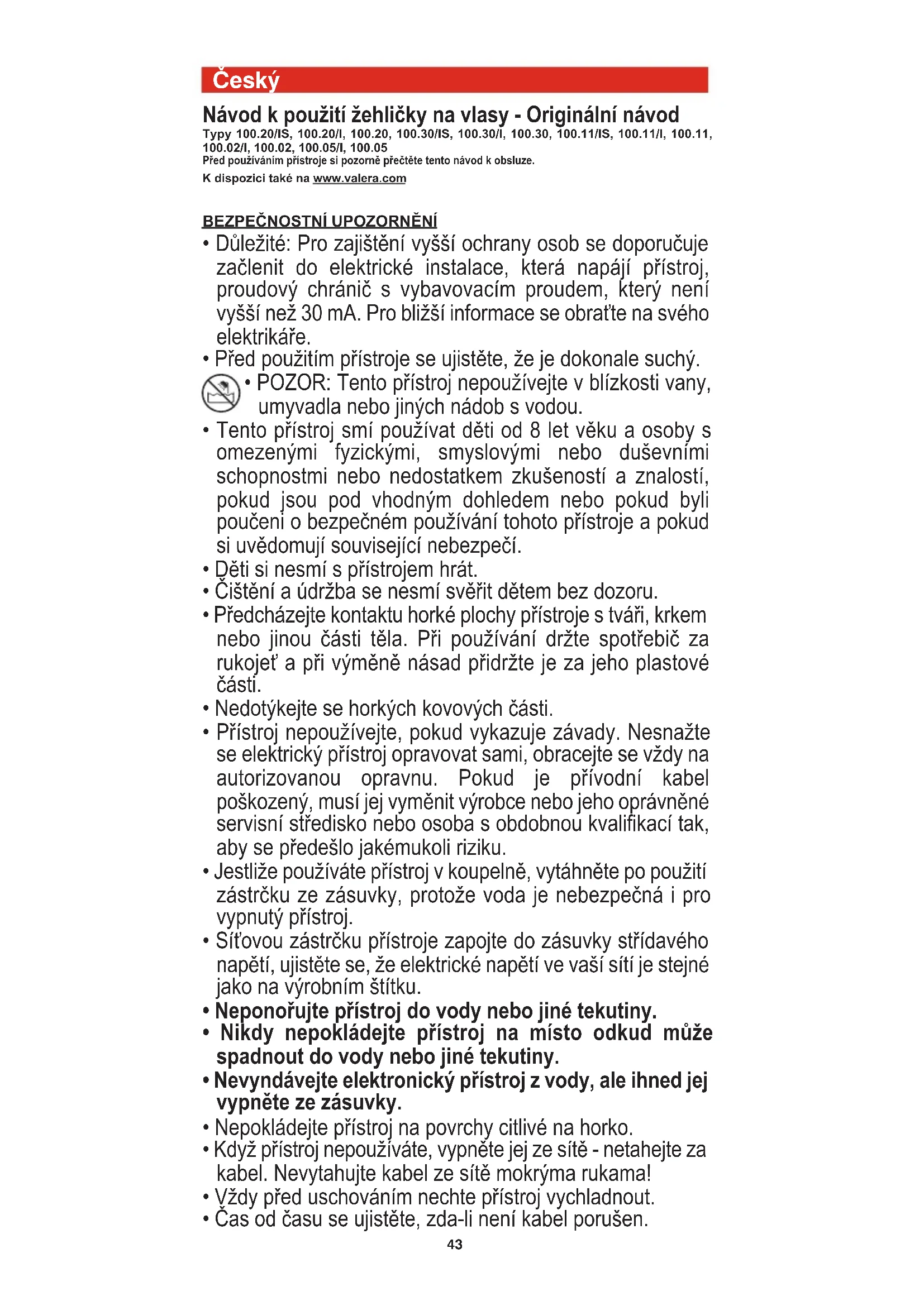 a még meleg hajszálakat, elzárják a hajhám felső rétegét, és elkerülik a túlzott hőhatást a hullám rögzítésénél. 00060714 int_mar2017:Layout 1 07/03/2017 9.20 Pagina 4243 Český Návod k použití žehličky na vlasy - Originální návod Typy 100.20/IS, 100.20/I, 100.20, 100.30/IS, 100.30/I, 100.30, 100.11/IS, 100.11/I, 100.11, 100.02/I, 100.02, 100.05/I, 100.05 Před používáním přístroje si pozorně přečtěte tento návod k obsluze. K dispozici také na www.valera.com