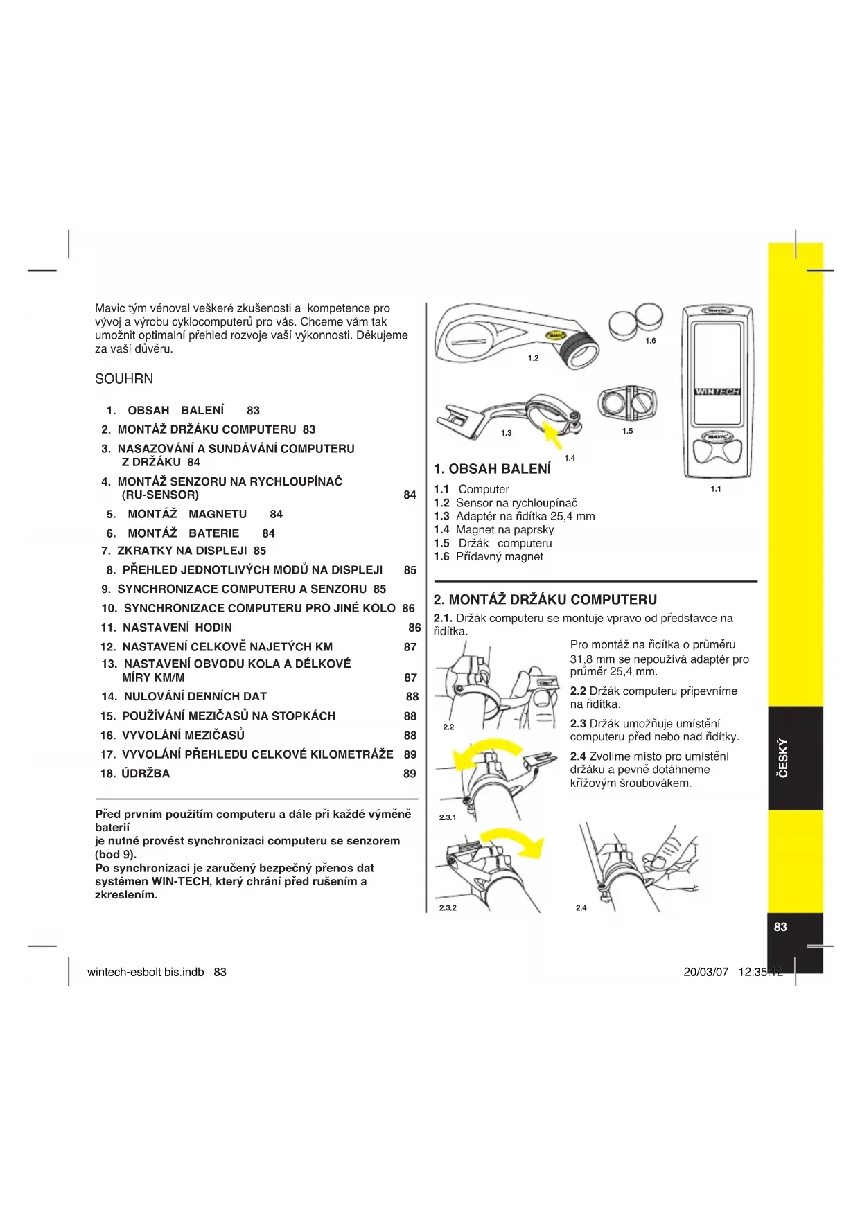 wintech-esbolt bis.indb 84wintech-esbolt bis.indb 84 20/03/07 12:35:1320/03/07 12:35:13 Cyan quadriMagenta quadriJaune quadriNoir quadri85 ČESKÝ těsnění pod víčkem. V případě poškození víčka, či těsnění, musíme oba díly vyměnit. Výměnu baterie provádíme vždy v suchém prostředí. Při výměně baterií dojde ke ztrátě uvedených dat: celkové najeté KM, nastavení KM-M, obvod kola, hodiny Při první montáži, či následných výměnách baterií v computeru,či senzoru je vždy nutné provést synchronizaci (bod 9). Životnost baterií: 12 až 24 měsíců podle používání a provozu. ých me a tak,