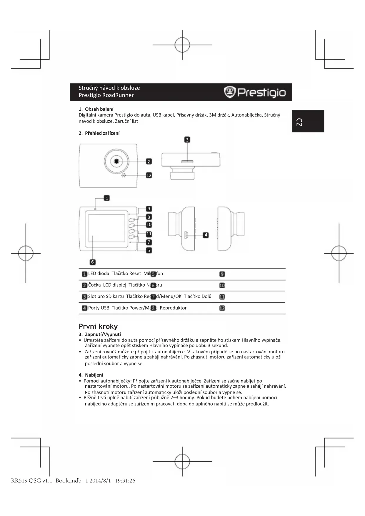 - Běžně trvá úplně nabití zařízení přibližně 2–3 hodiny. Pokud budete během nabíjení pomocí nabíjecího adaptéru se zařízením pracovat, doba do úplného nabití se může prodloužit. RR519 QSG v1.1_Book.indb 1 2014/8/1 19:31:26Stručný návod k obsluze Prestigio RoadRunner