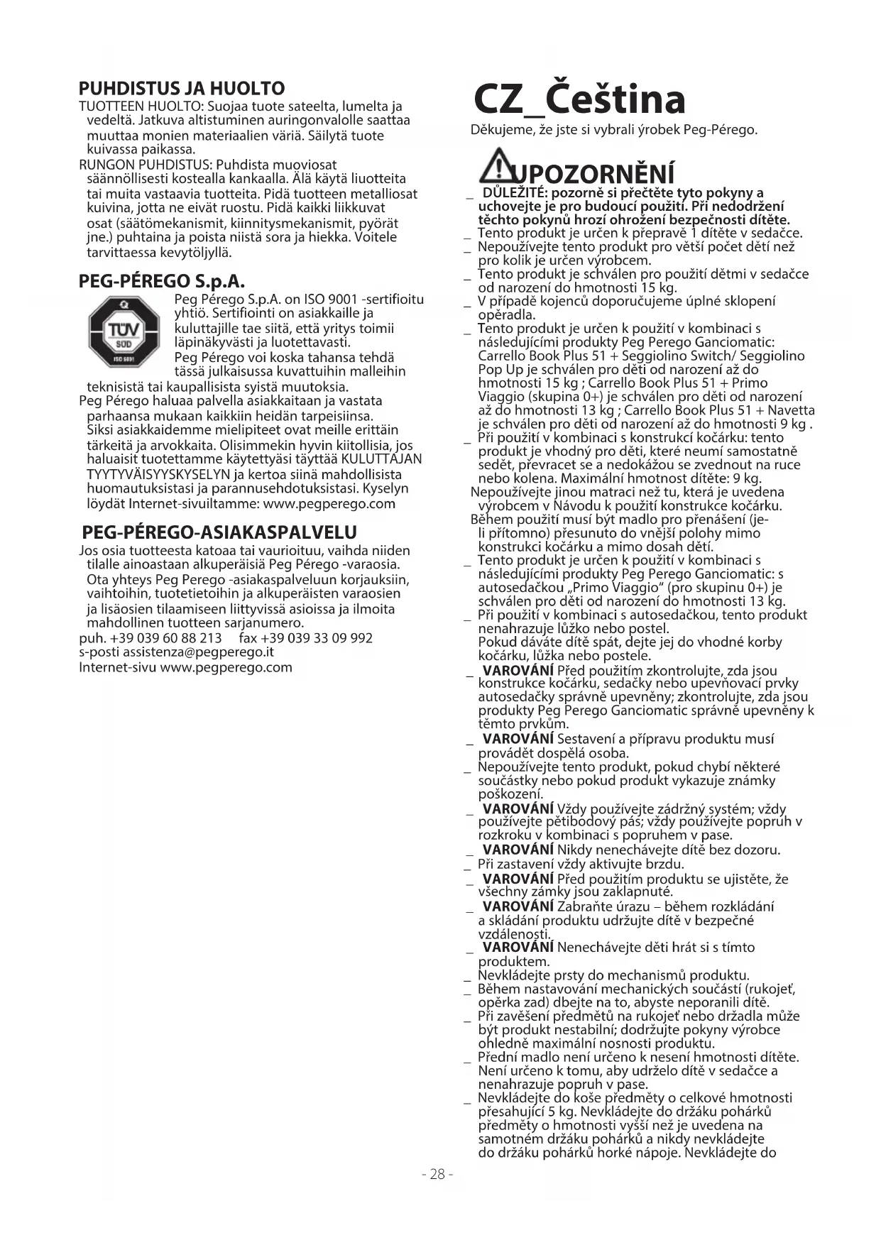 TUOTTEEN HUOLTO: Suojaa tuote sateelta, lumelta ja vedeltä. Jatkuva altistuminen auringonvalolle saattaa muuttaa monien materiaalien väriä. Säilytä tuote kuivassa paikassa. RUNGON PUHDISTUS: Puhdista muoviosat säännöllisesti kostealla kankaalla. Älä käytä liuotteita tai muita vastaavia tuotteita. Pidä tuotteen metalliosat kuivina, jotta ne eivät ruostu. Pidä kaikki liikkuvat osat (säätömekanismit, kiinnitysmekanismit, pyörät jne.) puhtaina ja poista niistä sora ja hiekka. Voitele tarvittaessa kevytöljyllä. PEG-PÉREGO S.p.A. Peg Pérego S.p.A. on ISO 9001 -sertifioitu yhtiö. Sertifiointi on asiakkaille ja kuluttajille tae siitä, että yritys toimii läpinäkyvästi ja luotettavasti. Peg Pérego voi koska tahansa tehdä tässä julkaisussa kuvattuihin malleihin teknisistä tai kaupallisista syistä muutoksia. Peg Pérego haluaa palvella asiakkaitaan ja vastata parhaansa mukaan kaikkiin heidän tarpeisiinsa. Siksi asiakkaidemme mielipiteet ovat meille erittäin tärkeitä ja arvokkaita. Olisimmekin hyvin kiitollisia, jos haluaisit tuotettamme käytettyäsi täyttää KULUTTAJAN TYYTYVÄISYYSKYSELYN ja kertoa siinä mahdollisista huomautuksistasi ja parannusehdotuksistasi. Kyselyn löydät Internet-sivuiltamme: www.pegperego.com PEG-PÉREGO-ASIAKASPALVELU Jos osia tuotteesta katoaa tai vaurioituu, vaihda niiden tilalle ainoastaan alkuperäisiä Peg Pérego -varaosia. Ota yhteys Peg Perego -asiakaspalveluun korjauksiin, vaihtoihin, tuotetietoihin ja alkuperäisten varaosien ja lisäosien tilaamiseen liittyvissä asioissa ja ilmoita mahdollinen tuotteen sarjanumero. puh. +39 039 60 88 213 fax +39 039 33 09 992 s-posti assistenza@pegperego.it Internet-sivu www.pegperego.com CZ_Čeština Děkujeme, že jste si vybrali ýrobek Peg-Pérego. UPOZORNĚNÍ _ DŮLEŽITÉ: pozorně si přečtěte tyto pokyny a uchovejte je pro budoucí použití. Při nedodržení těchto pokynů hrozí ohrožení bezpečnosti dítěte. _ Tento produkt je určen k přepravě 1 dítěte v sedačce. _ Nepoužívejte tento produkt pro větší počet dětí než pro kolik je určen výrobcem. _ Tento produkt je schválen pro použití dětmi v sedačce od narození do hmotnosti 15 kg. _ V případě kojenců doporučujeme úplné sklopení opěradla. _ Tento produkt je určen k použití v kombinaci s následujícími produkty Peg Perego Ganciomatic: Carrello Book Plus 51 + Seggiolino Switch/ Seggiolino Pop Up je schválen pro děti od narození až do hmotnosti 15 kg ; Carrello Book Plus 51 + Primo Viaggio (skupina 0+) je schválen pro děti od narození až do hmotnosti 13 kg ; Carrello Book Plus 51 + Navetta je schválen pro děti od narození až do hmotnosti 9 kg . _ Při použití v kombinaci s konstrukcí kočárku: tento produkt je vhodný pro děti, které neumí samostatně sedět, převracet se a nedokážou se zvednout na ruce nebo kolena. Maximální hmotnost dítěte: 9 kg. Nepoužívejte jinou matraci než tu, která je uvedena výrobcem v Návodu k použití konstrukce kočárku. Během použití musí být madlo pro přenášení (je- li přítomno) přesunuto do vnější polohy mimo konstrukci kočárku a mimo dosah dětí. _ Tento produkt je určen k použití v kombinaci s následujícími produkty Peg Perego Ganciomatic: s autosedačkou „Primo Viaggio“ (pro skupinu 0+) je schválen pro děti od narození do hmotnosti 13 kg. _ Při použití v kombinaci s autosedačkou, tento produkt nenahrazuje lůžko nebo postel. Pokud dáváte dítě spát, dejte jej do vhodné korby kočárku, lůžka nebo postele. _ VAROVÁNÍ Před použitím zkontrolujte, zda jsou konstrukce kočárku, sedačky nebo upevňovací prvky autosedačky správně upevněny; zkontrolujte, zda jsou produkty Peg Perego Ganciomatic správně upevněny k těmto prvkům. _ VAROVÁNÍ Sestavení a přípravu produktu musí provádět dospělá osoba. _ Nepoužívejte tento produkt, pokud chybí některé součástky nebo pokud produkt vykazuje známky poškození. _ VAROVÁNÍ Vždy používejte zádržný systém; vždy používejte pětibodový pás; vždy používejte popruh v rozkroku v kombinaci s popruhem v pase. _ VAROVÁNÍ Nikdy nenechávejte dítě bez dozoru. _ Při zastavení vždy aktivujte brzdu. _ VAROVÁNÍ Před použitím produktu se ujistěte, že všechny zámky jsou zaklapnuté. _ VAROVÁNÍ Zabraňte úrazu – během rozkládání a skládání produktu udržujte dítě v bezpečné vzdálenosti. _ VAROVÁNÍ Nenechávejte děti hrát si s tímto produktem. _ Nevkládejte prsty do mechanismů produktu. _ Během nastavování mechanických součástí (rukojeť, opěrka zad) dbejte na to, abyste neporanili dítě. _ Při zavěšení předmětů na rukojeť nebo držadla může být produkt nestabilní; dodržujte pokyny výrobce ohledně maximální nosnosti produktu. _ Přední madlo není určeno k nesení hmotnosti dítěte. Není určeno k tomu, aby udrželo dítě v sedačce a nenahrazuje popruh v pase. _ Nevkládejte do koše předměty o celkové hmotnosti přesahující 5 kg. Nevkládejte do držáku pohárků předměty o hmotnosti vyšší než je uvedena na samotném držáku pohárků a nikdy nevkládejte do držáku pohárků horké nápoje. Nevkládejte do- 29 - střešních kapes (jsou-li součástí produktu) předměty o hmotnosti přesahující 0,2 kg. _ Nepoužívejte produkt v blízkosti schodišť nebo schodů, zdrojů tepla, otevřeného ohně nebo nebezpečných předmětů v dosahu dítěte. _ Musí se používat pouze náhradní díly dodané nebo doporučené výrobcem/distributorem. _ VAROVÁNÍ Nepoužívejte stříšku proti dešti (je- li součástí produktu) v interiérech a pravidelně kontrolujte, zda dítěti není příliš teplo. Nenechávejte kočárek v blízkosti zdrojů tepla a udržujte zapálené cigarety v bezpečné vzdálenosti. Ochrana proti dešti se nesmí použít na kočárku, který nemá stříšku nebo slunečník, na který by se dala