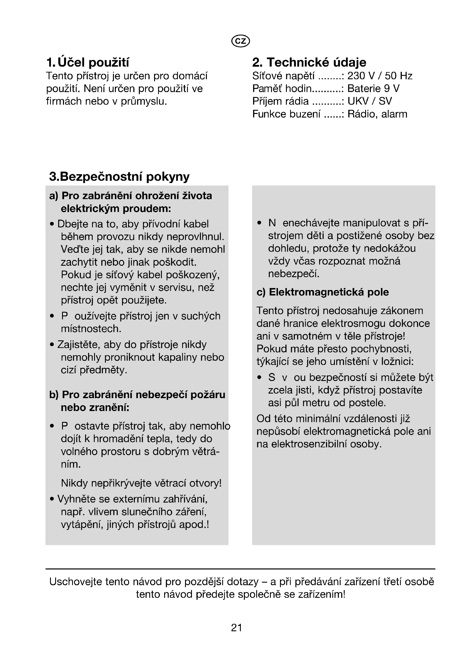Síťové napětí ........: 230 V / 50 Hz Paměť hodin..........: Baterie 9 V Příjem rádia ..........: UKV / SV Funkce buzení ......: Rádio, alarm Uschovejte tento návod pro pozdější dotazy – a při předávání zařízení třetí osobě tento návod předejte společně se zařízením! 3.Bezpečnostní pokyny a) Pro zabránění ohrožení života elektrickým proudem: