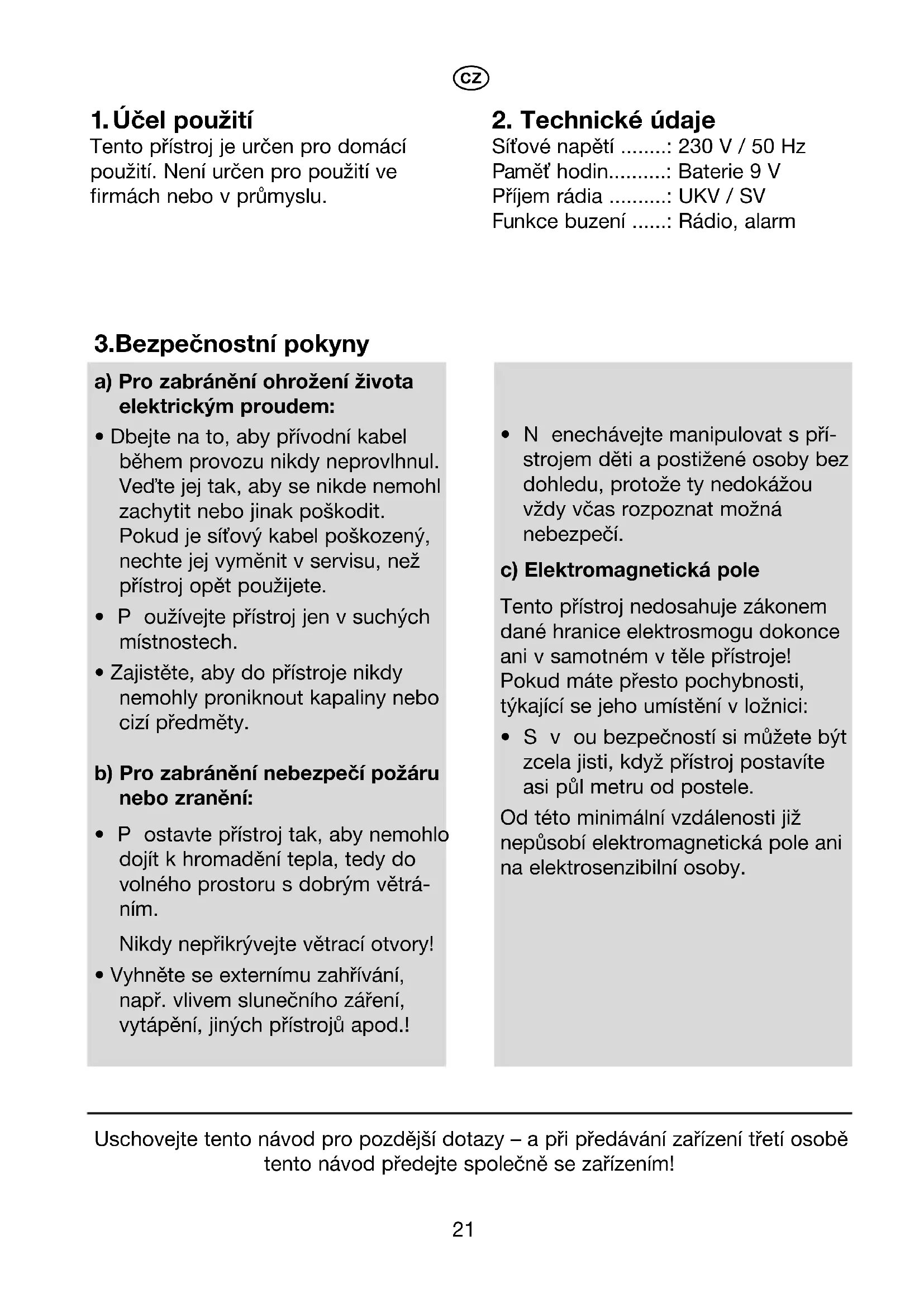 Síťové napětí ........: 230 V / 50 Hz Paměť hodin..........: Baterie 9 V Příjem rádia ..........: UKV / SV Funkce buzení ......: Rádio, alarm Uschovejte tento návod pro pozdější dotazy – a při předávání zařízení třetí osobě tento návod předejte společně se zařízením! 3.Bezpečnostní pokyny a) Pro zabránění ohrožení života elektrickým proudem: