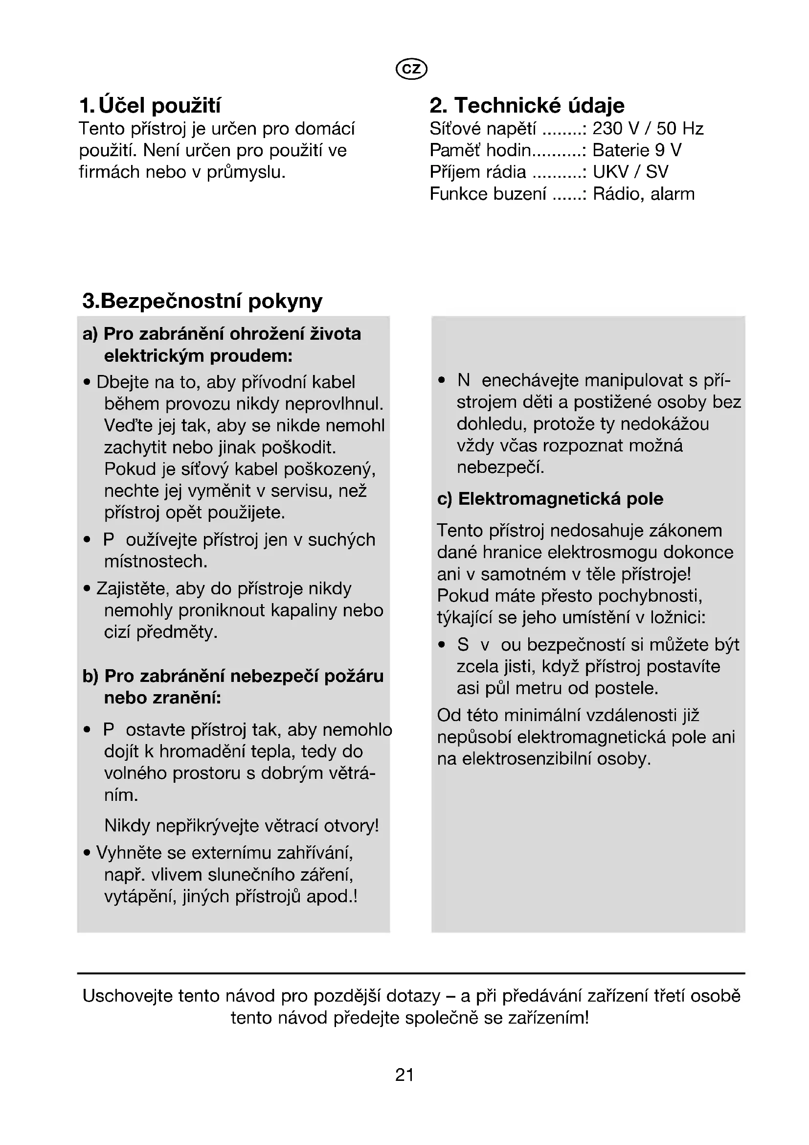Síťové napětí ........: 230 V / 50 Hz Paměť hodin..........: Baterie 9 V Příjem rádia ..........: UKV / SV Funkce buzení ......: Rádio, alarm Uschovejte tento návod pro pozdější dotazy – a při předávání zařízení třetí osobě tento návod předejte společně se zařízením! 3.Bezpečnostní pokyny a) Pro zabránění ohrožení života elektrickým proudem: